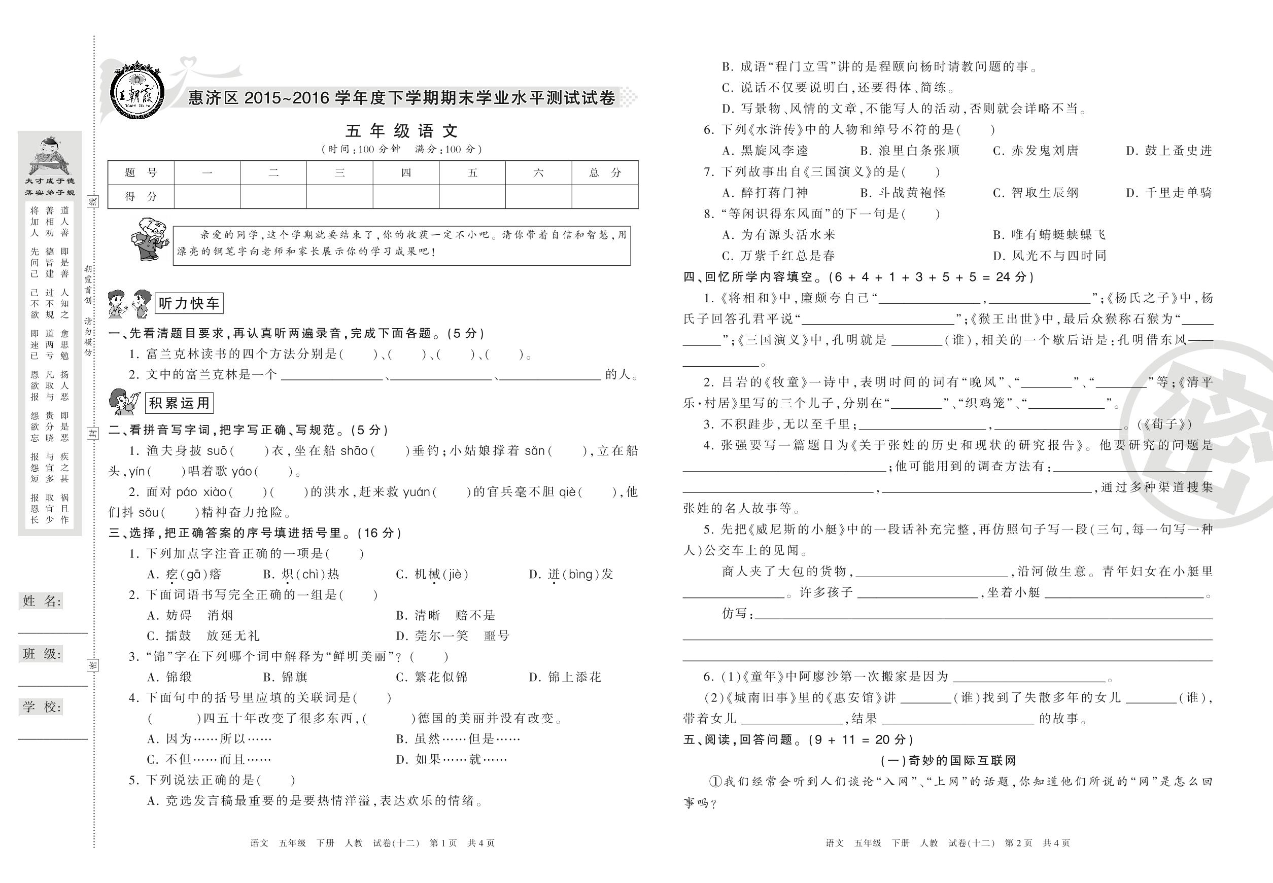 2015-2016学年第二学期郑州市惠济区五年级语文试卷(人教版)【12】