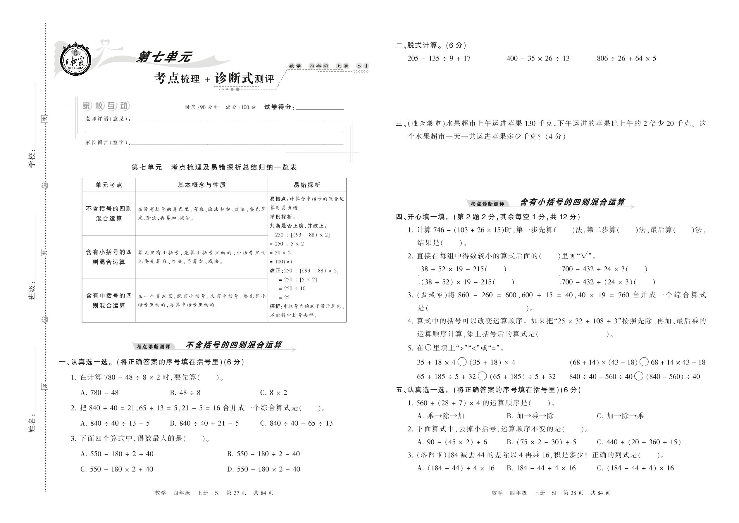 2021上册四年级数学苏教版 第七单元 考点梳理 + 诊断式测评