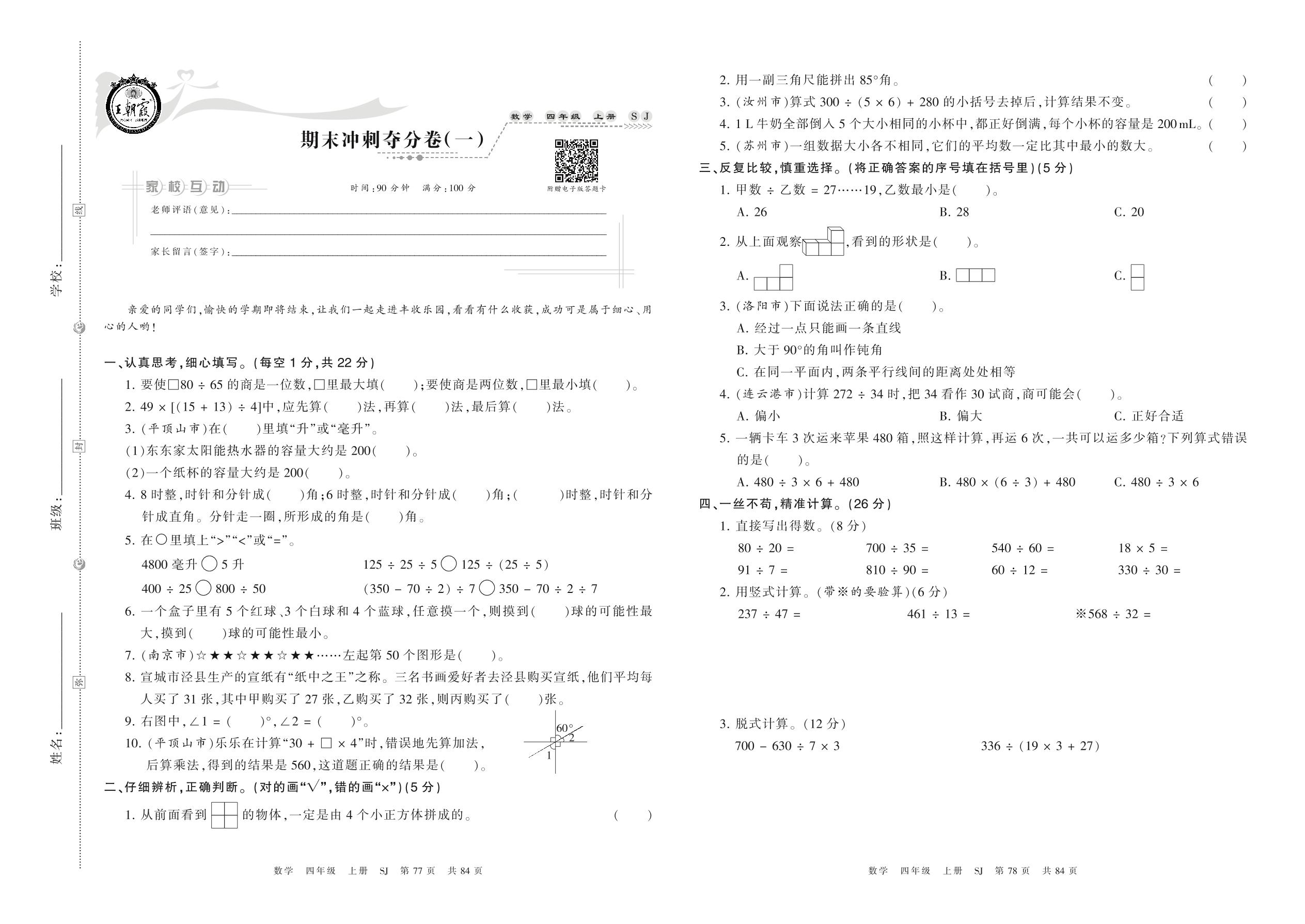 2021上册四年级数学苏教版 期末冲刺夺分卷(一)