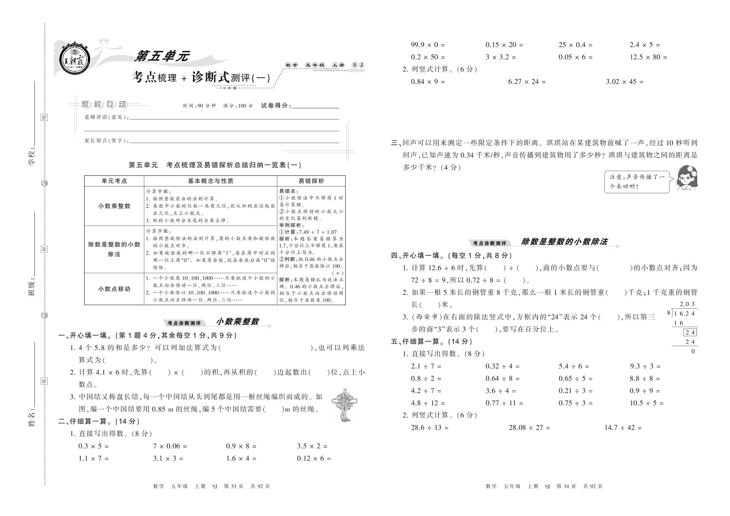 2021上册五年级数学苏教版 第五单元 考点梳理+诊断式测评(一)