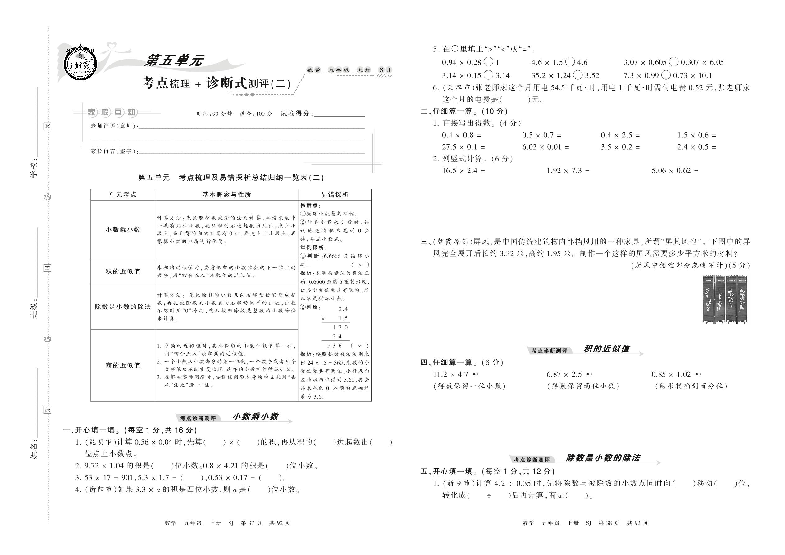 2021上册五年级数学苏教版 第五单元 考点梳理+诊断式测评(二)