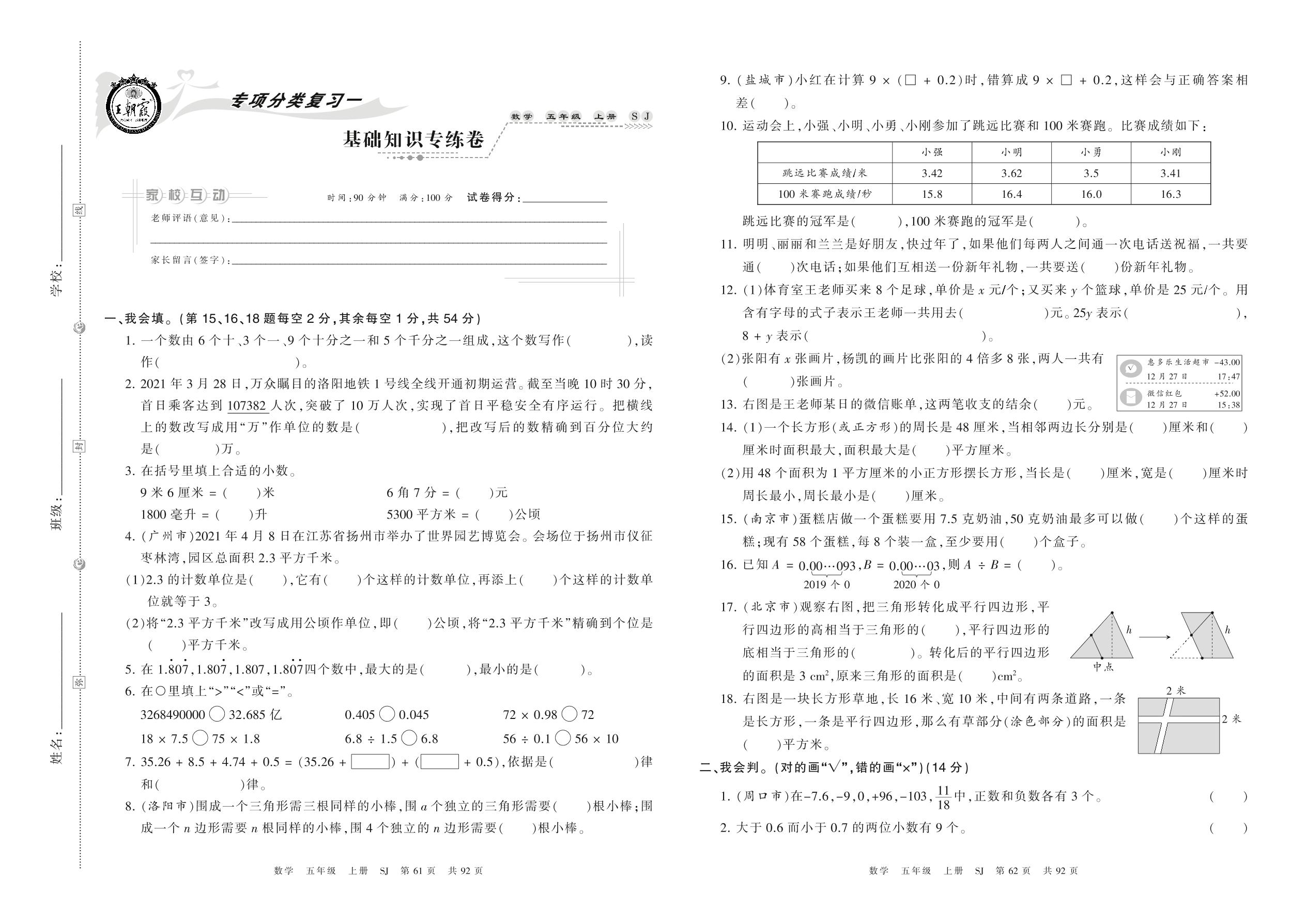 五年级数学苏教版上册专项卷