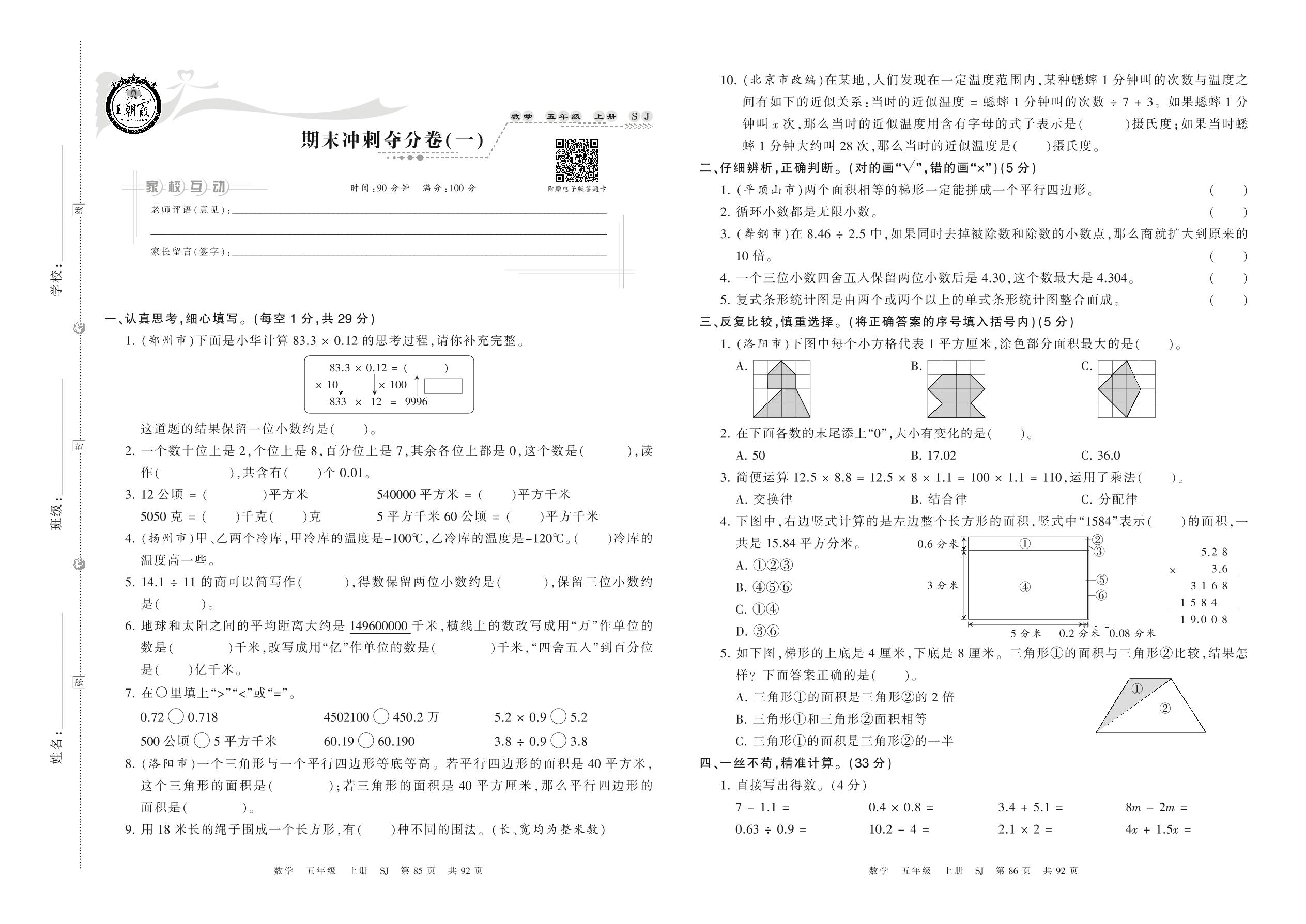 2021上册五年级数学苏教版 期末冲刺夺分卷(一)