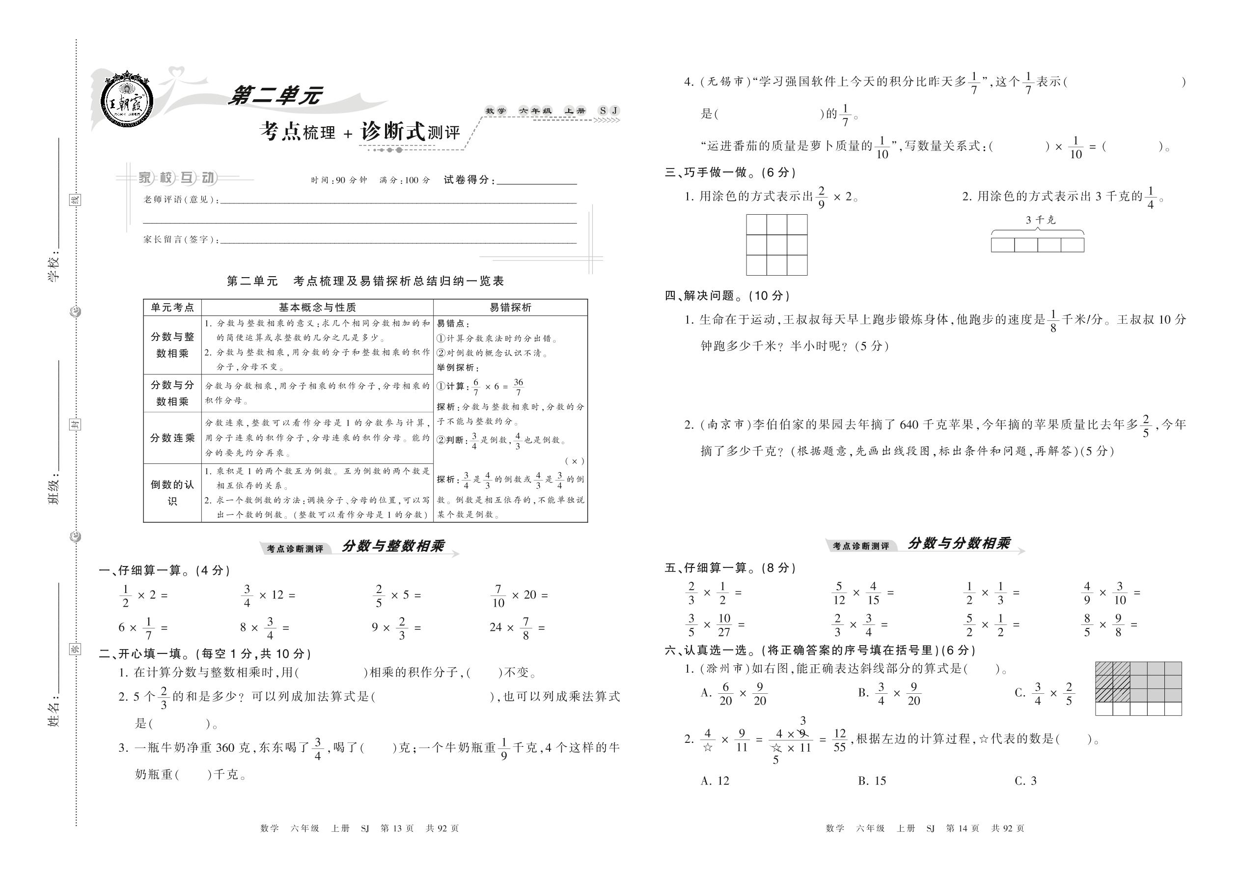 2021上册六年级数学苏教版 第二单元 考点梳理 + 诊断式测评