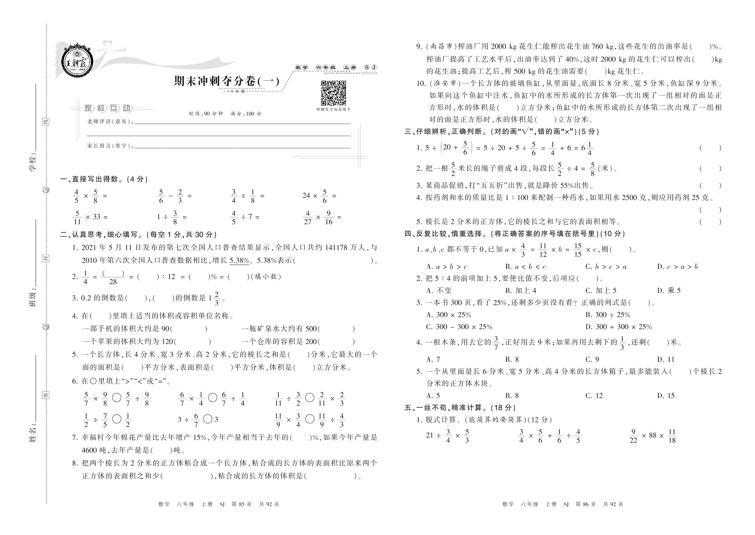 2021上册六年级数学苏教版 期末冲刺夺分卷(一)
