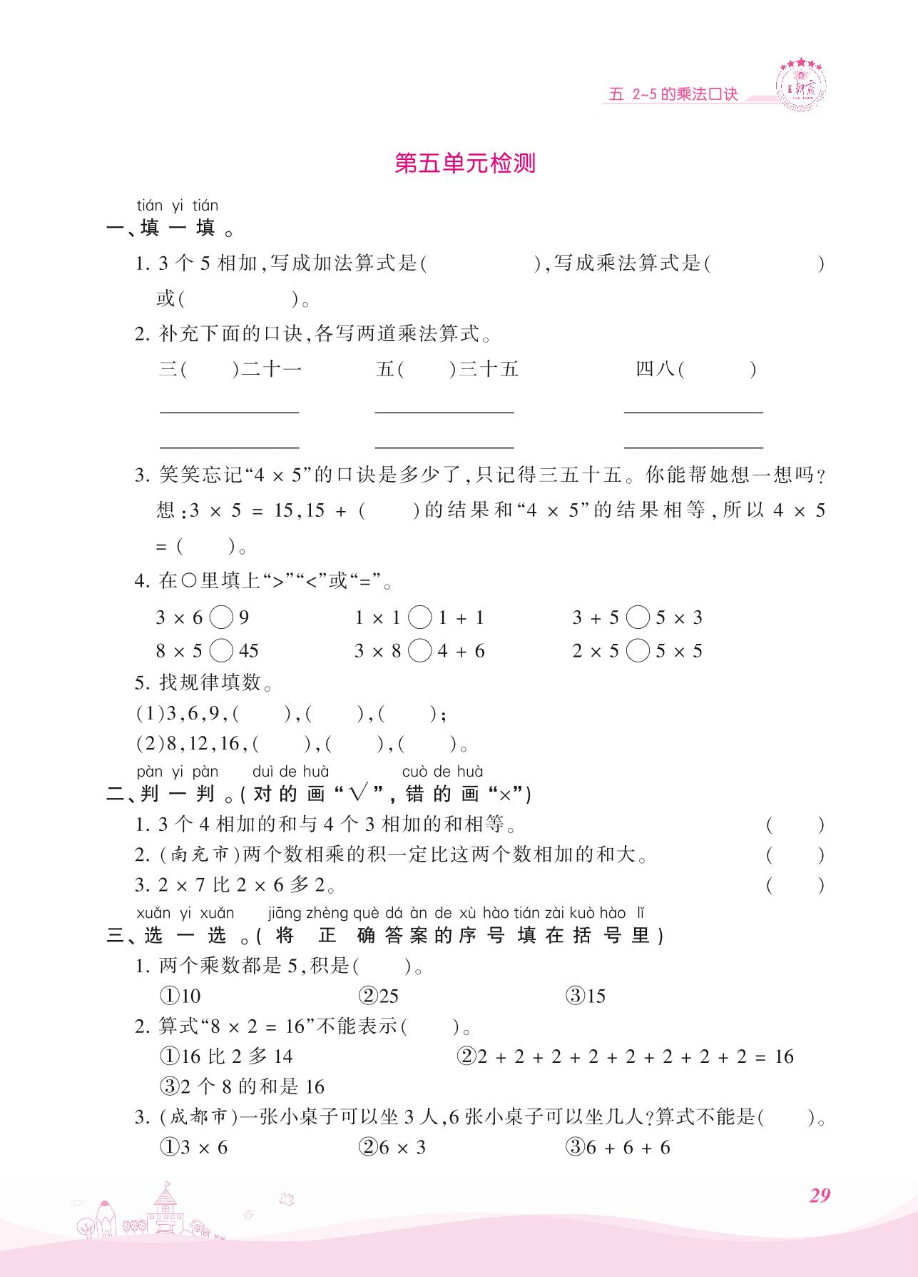 2021上册二年级数学北师版 五 2~5的乘法口诀——第五单元检测