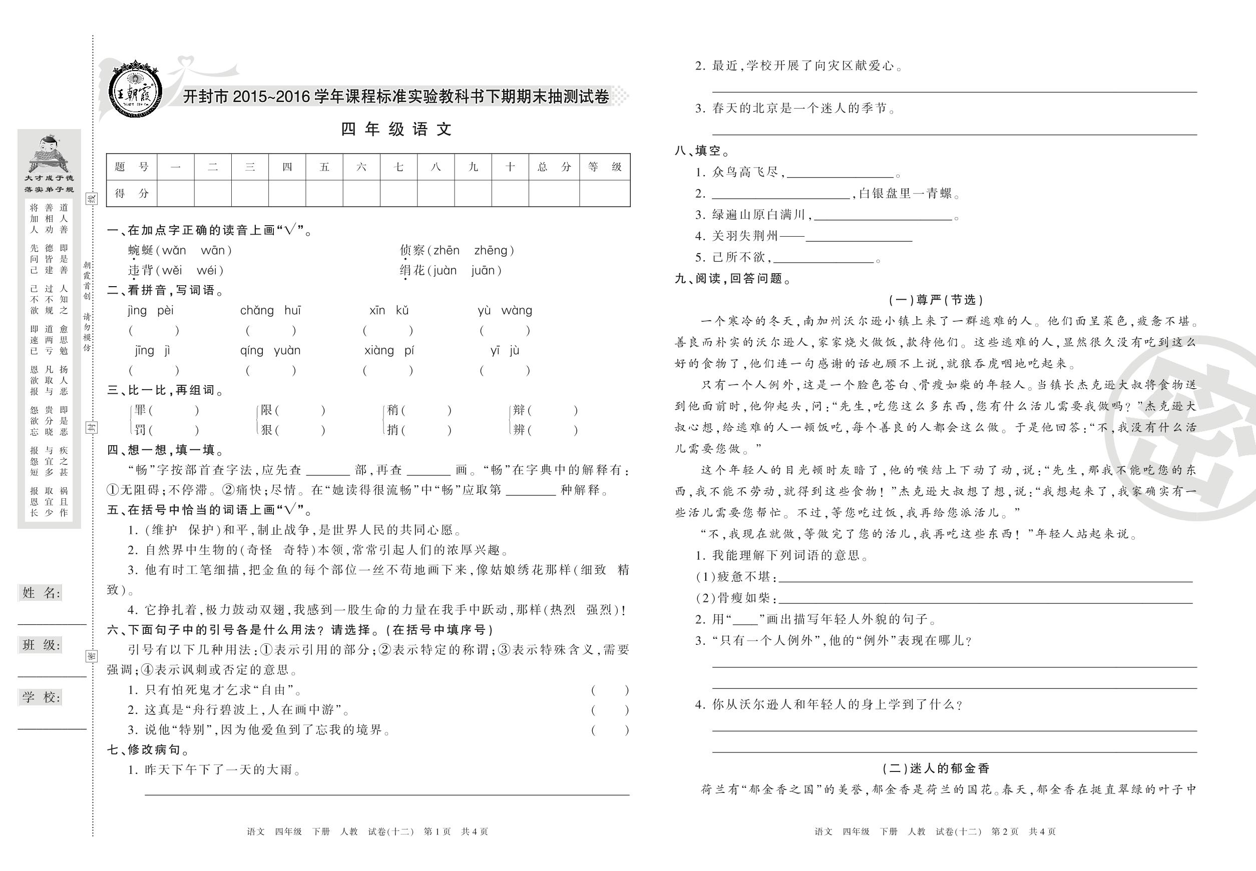 2015-2016学年第二学期开封市四年级语文试卷(人教版)【12】