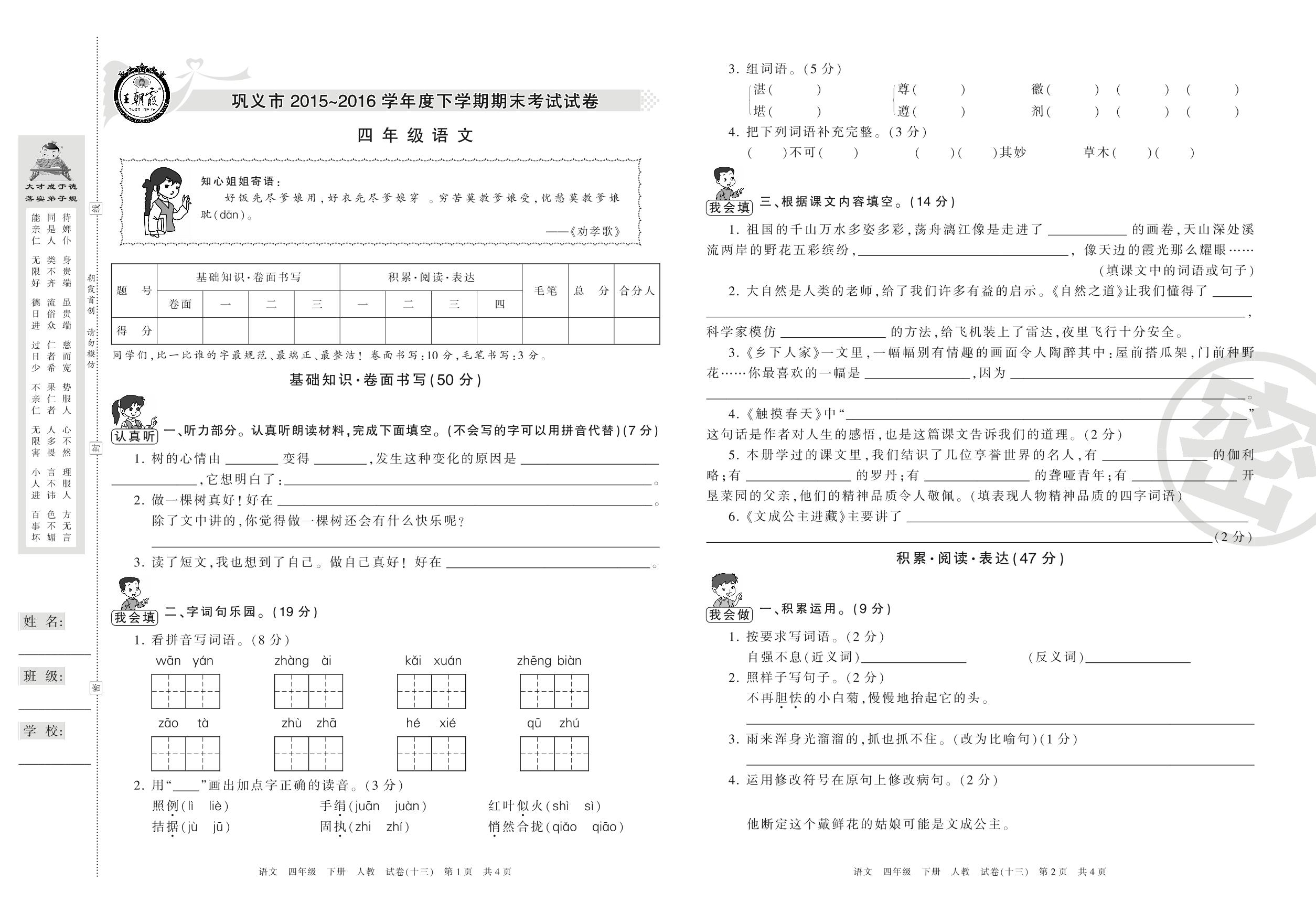 2015-2016学年第二学期巩义市四年级语文试卷(人教版)【13】