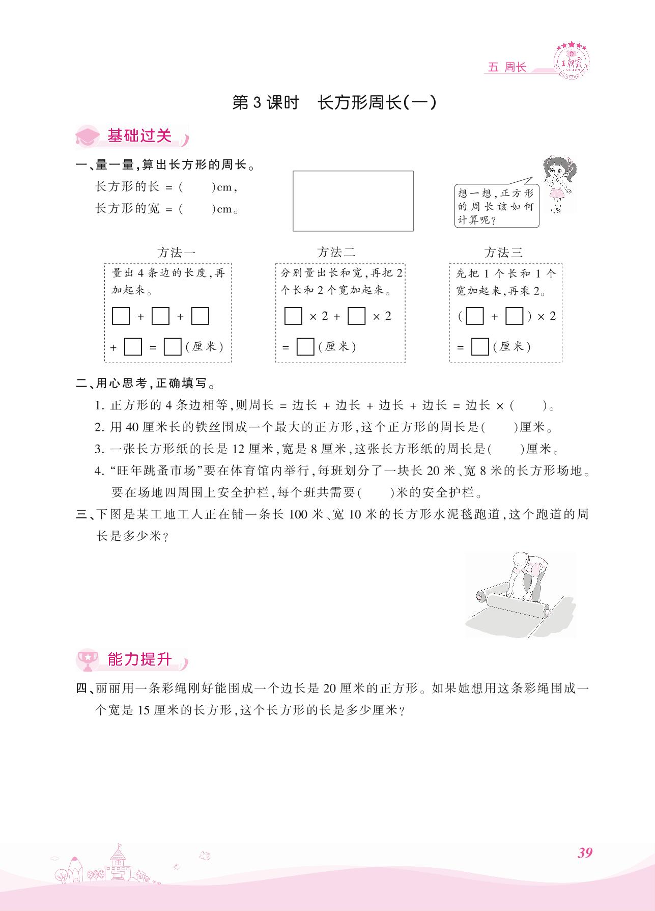 2021上册三年级数学北师版 五 周长——第3课时 长方形周长(一)