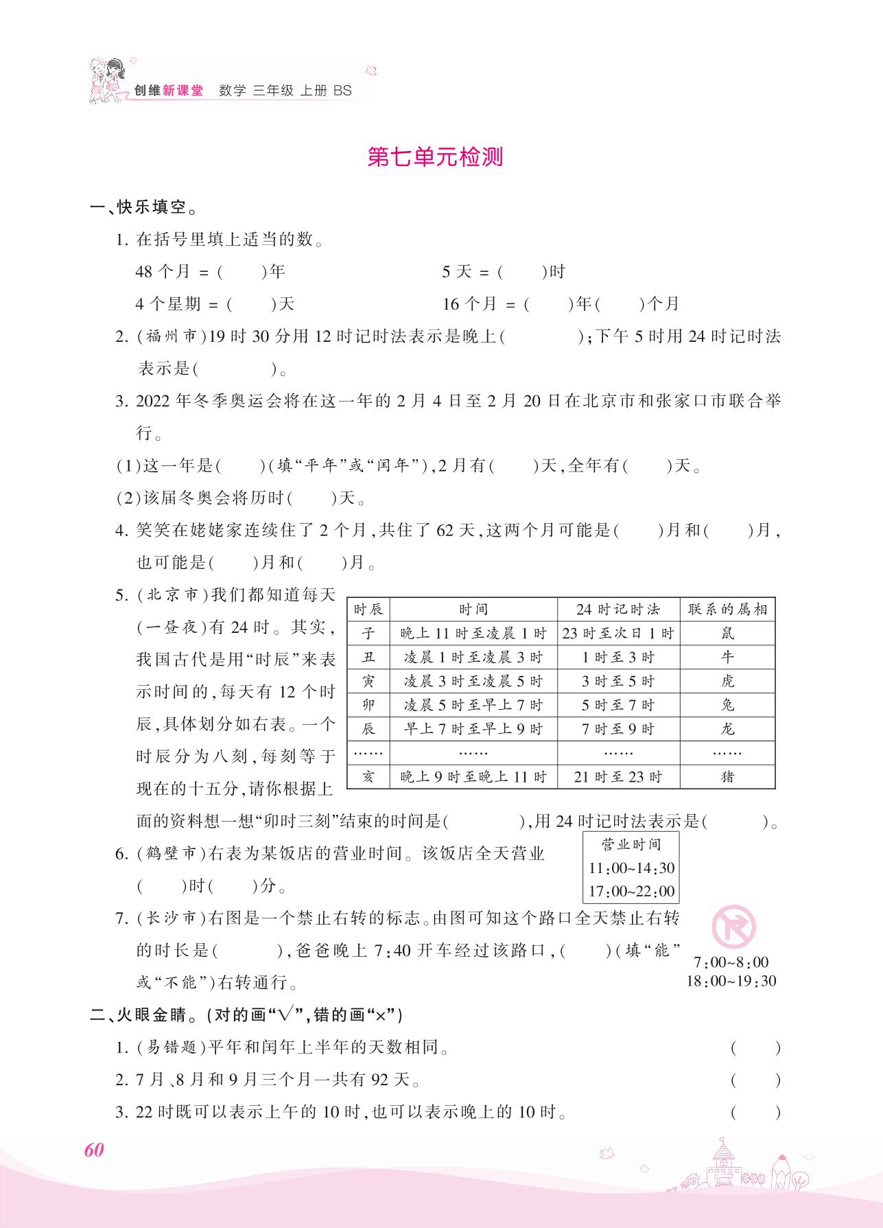 2021上册三年级数学北师版 七 年、月、日——第七单元检测