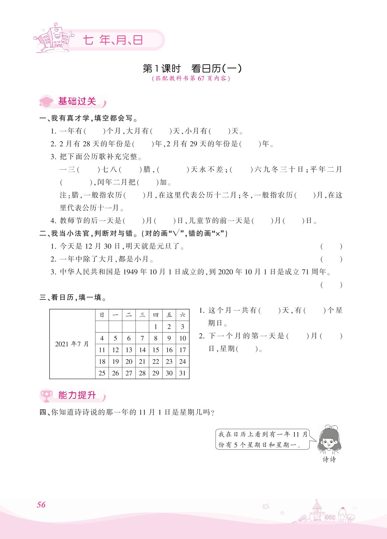 2021上册三年级数学北师版 七 年、月、日——第1课时 看日历(一)