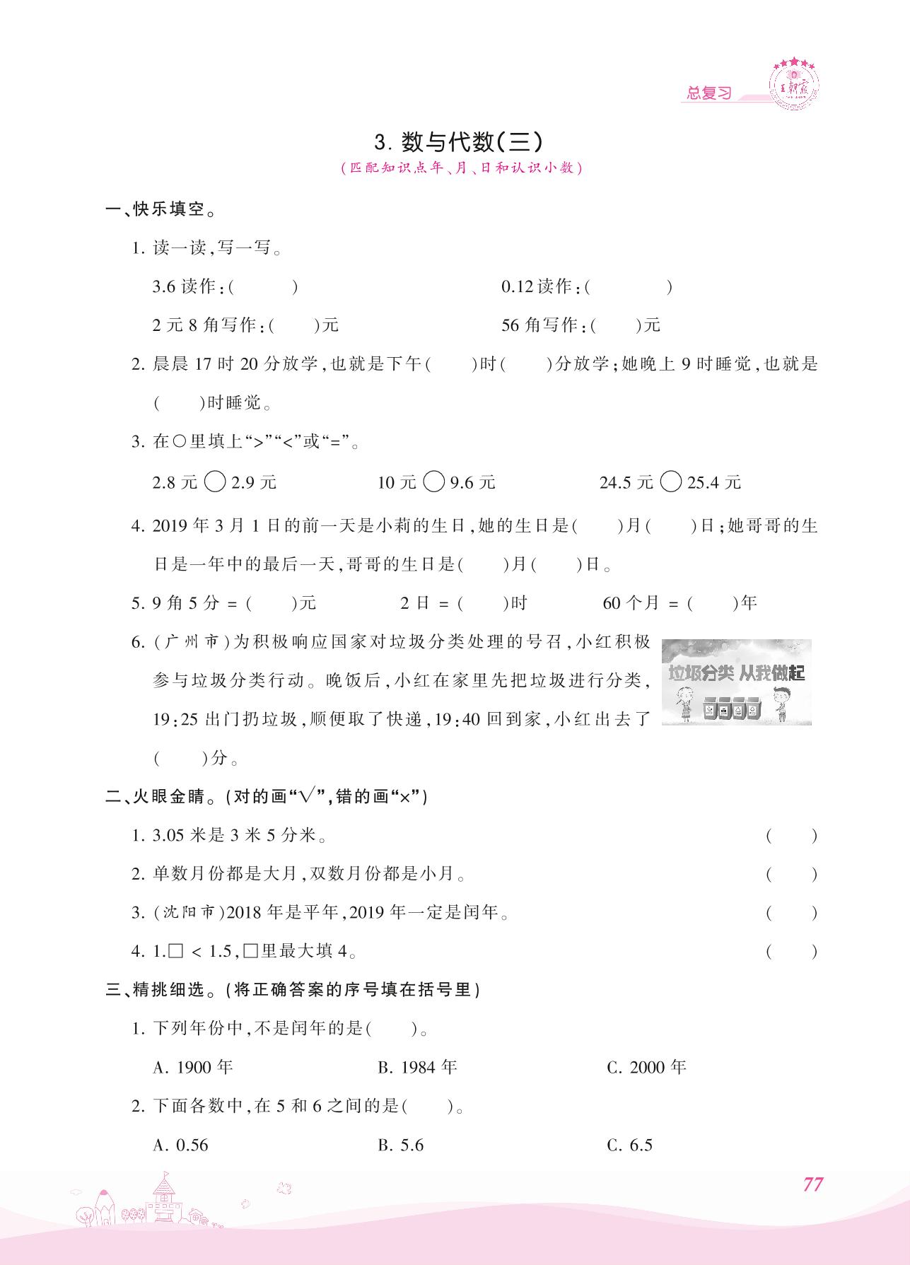 2021上册三年级数学北师版 总复习——3. 数与代数(三)
