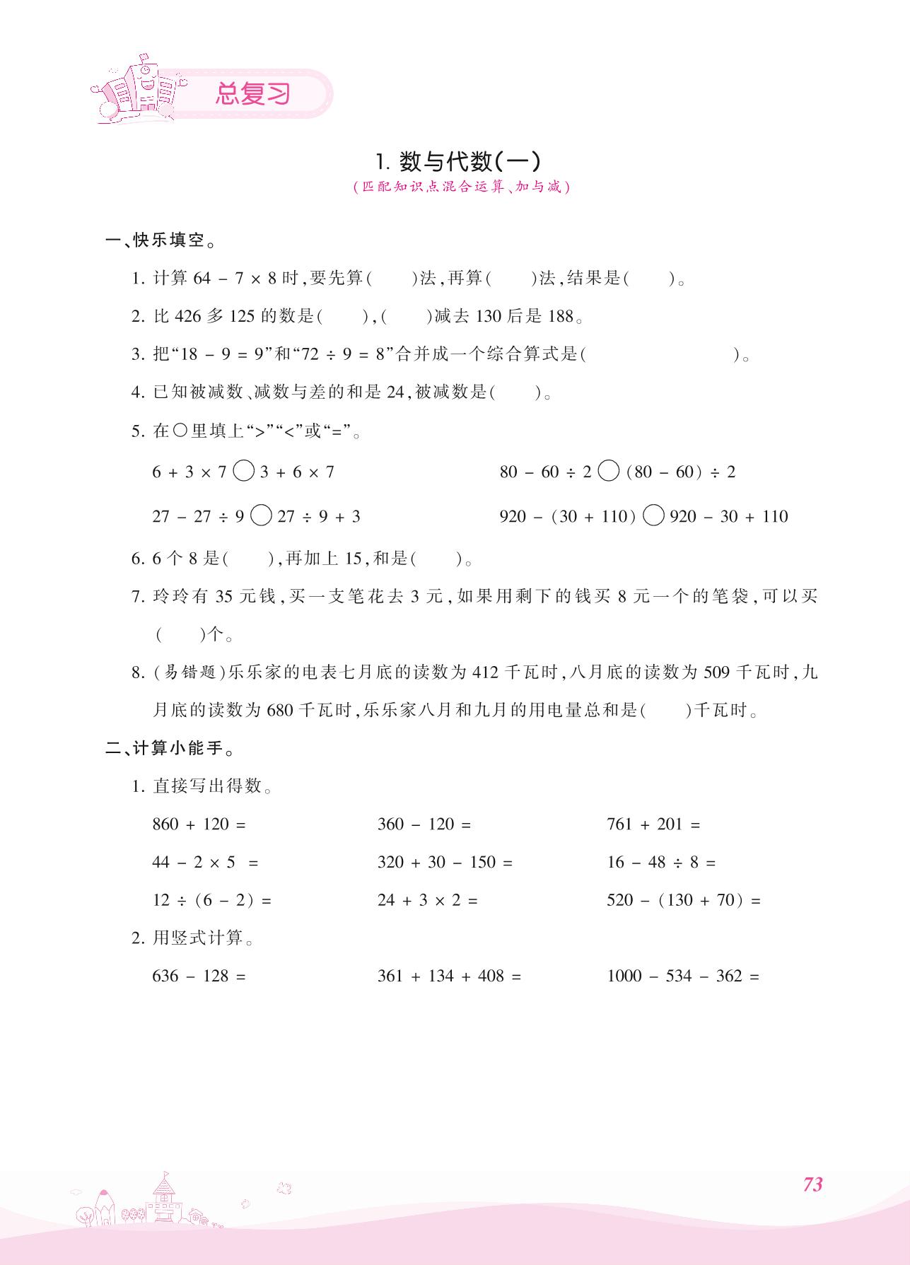 2021上册三年级数学北师版 总复习——1. 数与代数(一)