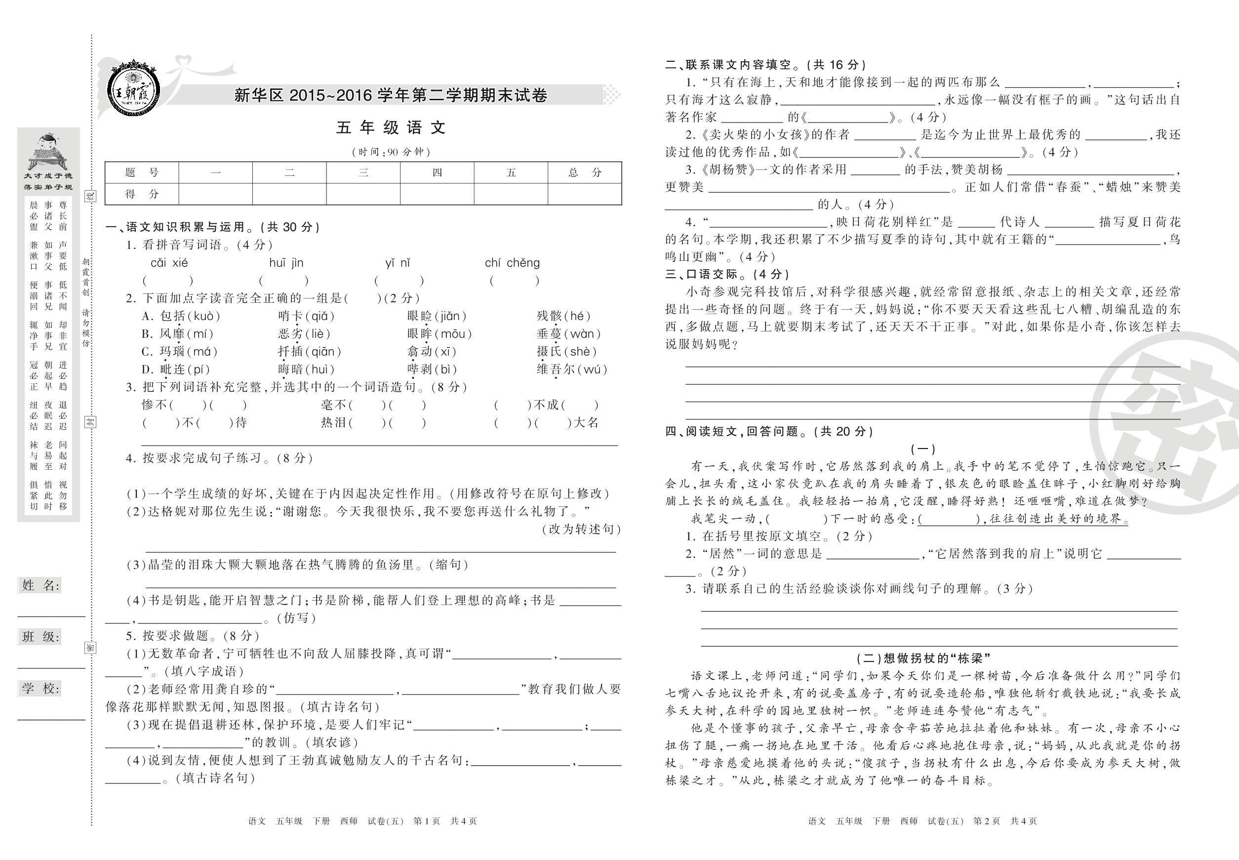 2015-2016学年第二学期平顶山市新华区五年级语文试卷(西师版)【5】