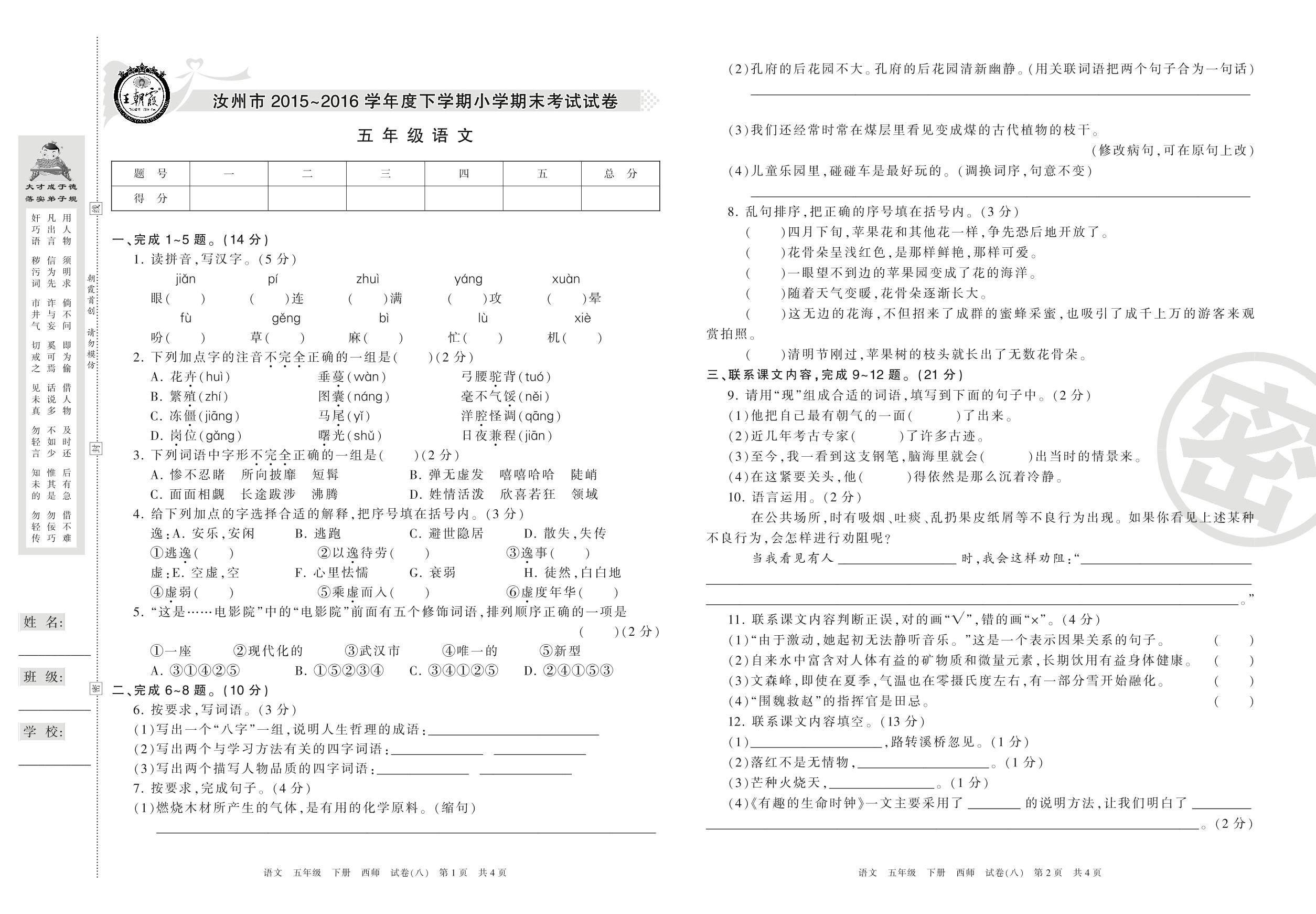 2015-2016学年第二学期汝州市五年级语文试卷(西师版)【8】