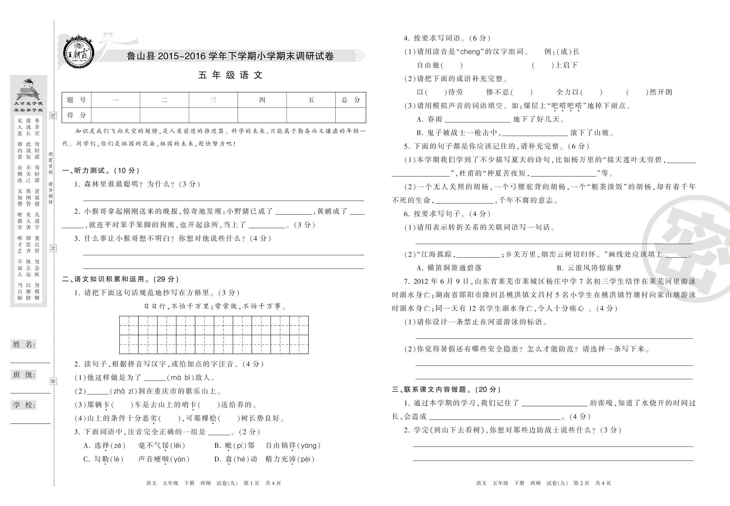 2015-2016学年第二学期平顶山市鲁山县五年级语文试卷(西师版)【9】