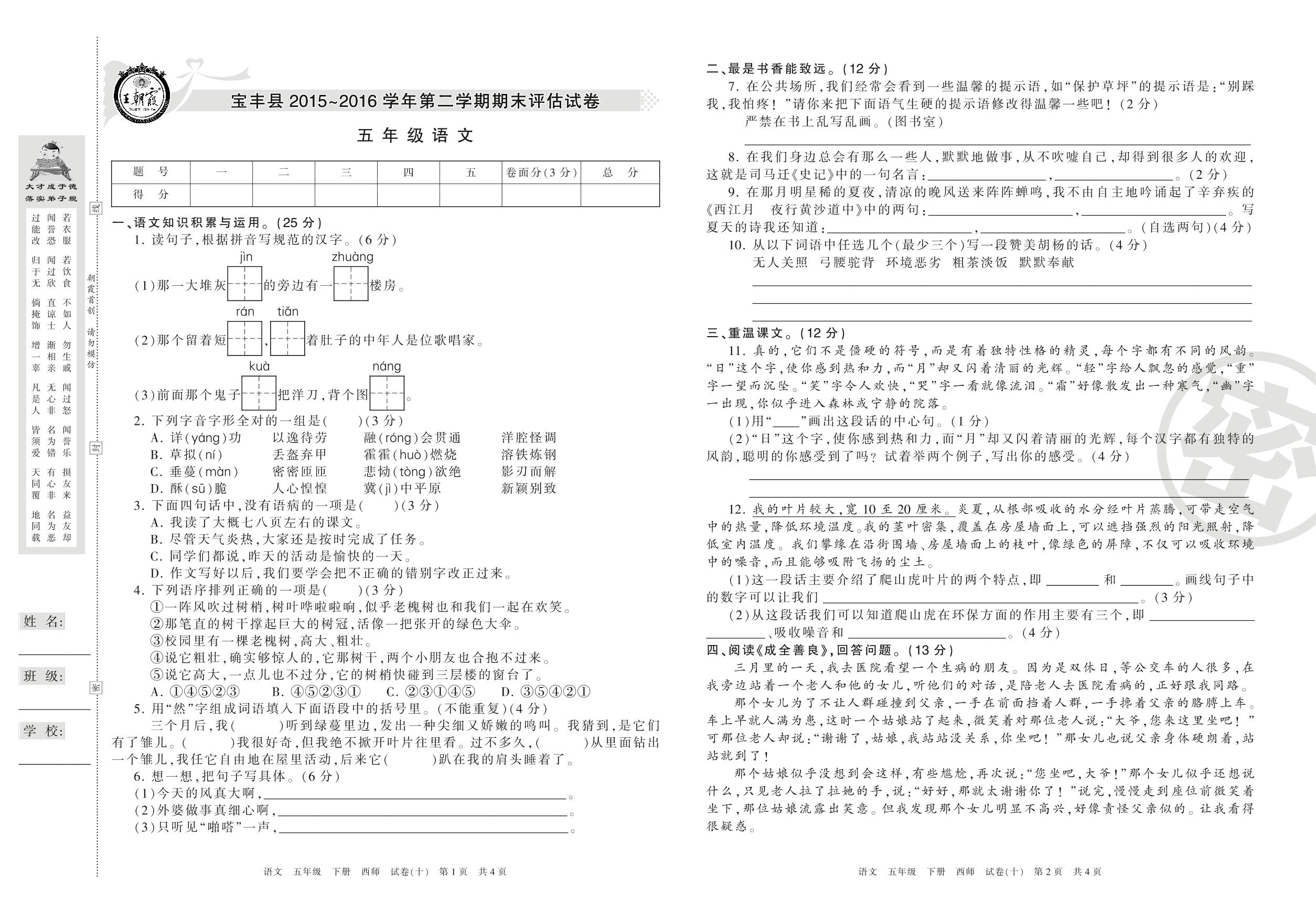 2015-2016学年第二学期平顶山市宝丰县五年级语文试卷(西师版)【10】