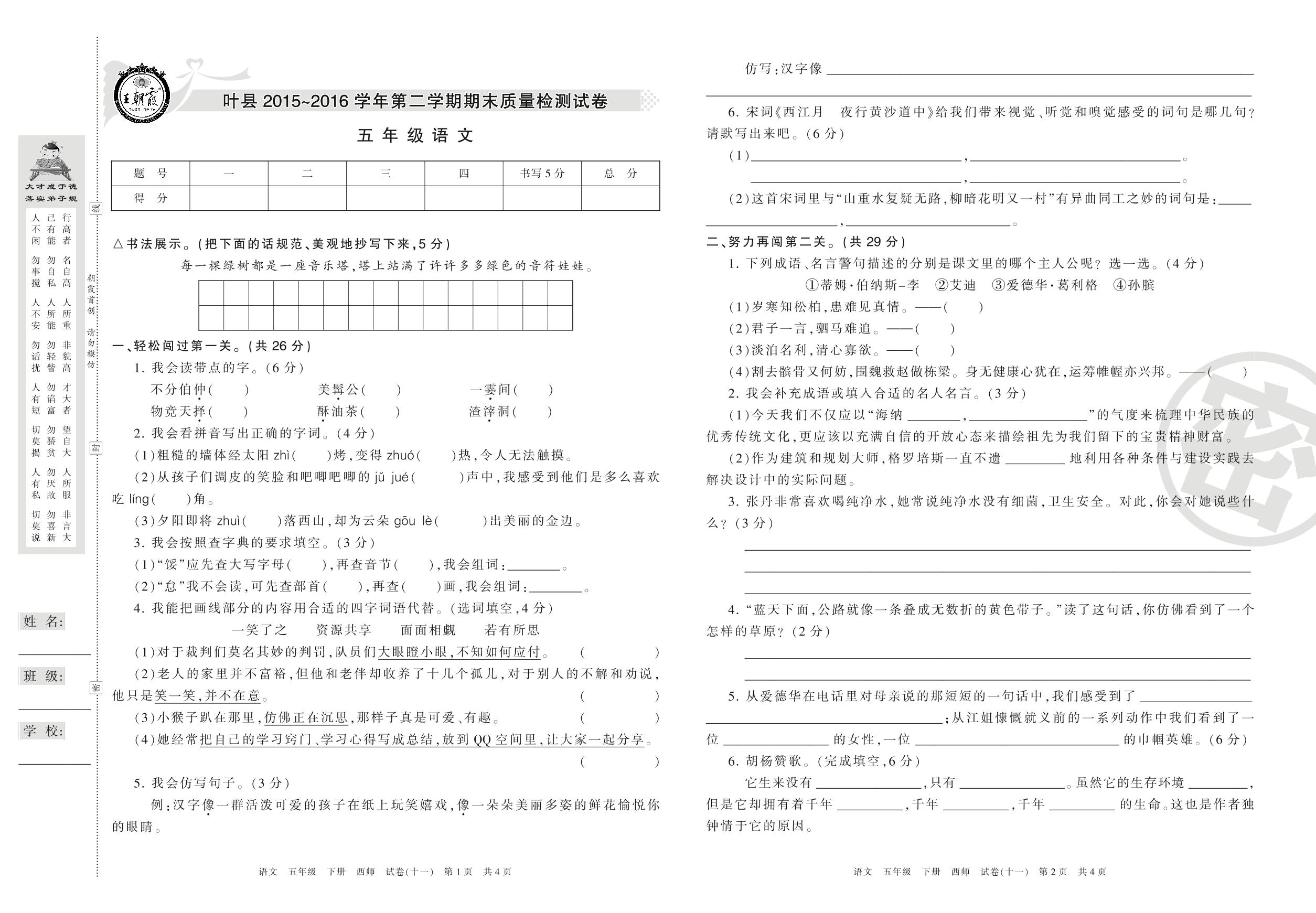 2015-2016学年第二学期平顶山市叶县五年级语文试卷(西师版)【11】