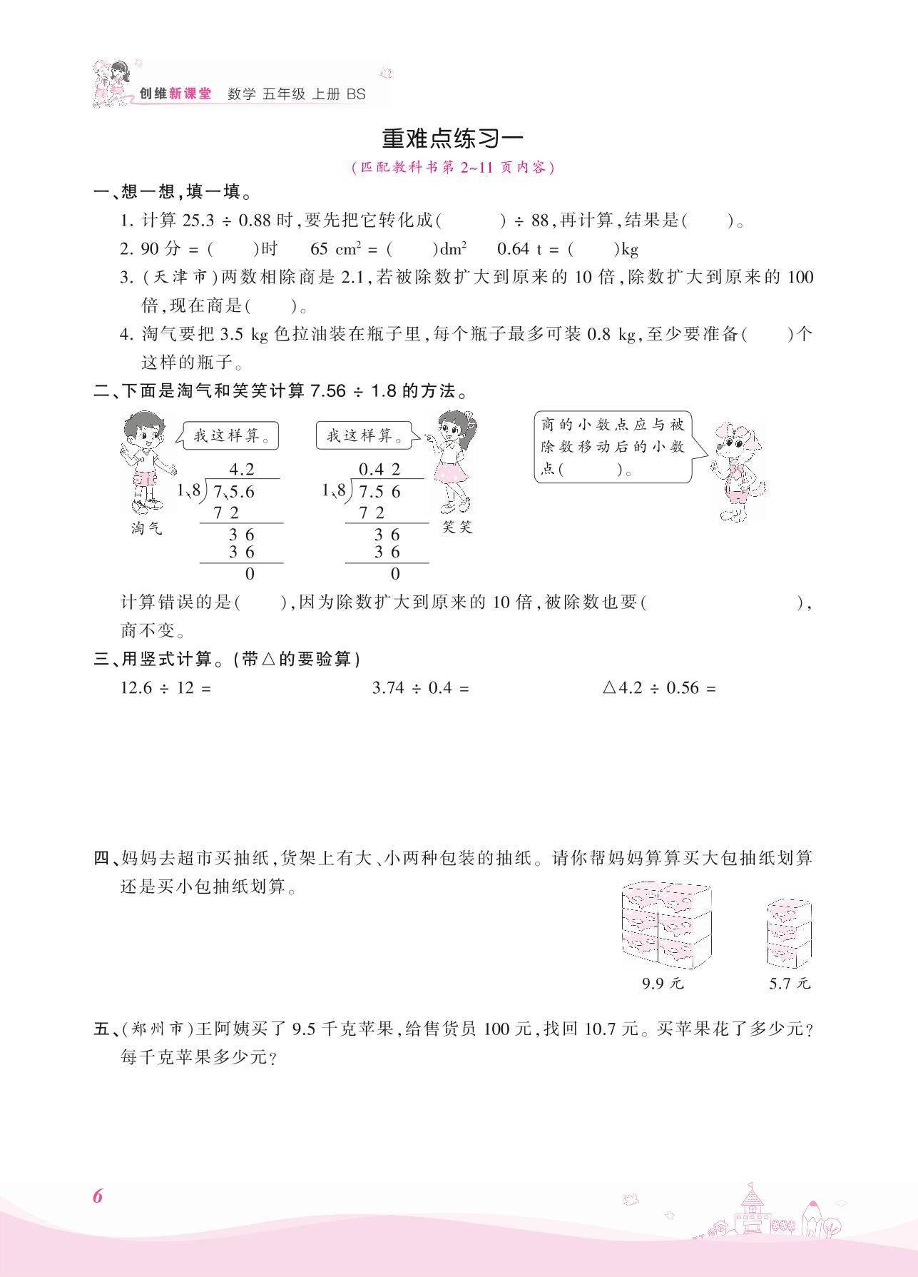 2021上册五年级数学北师版 一 小数除法——重难点练习一