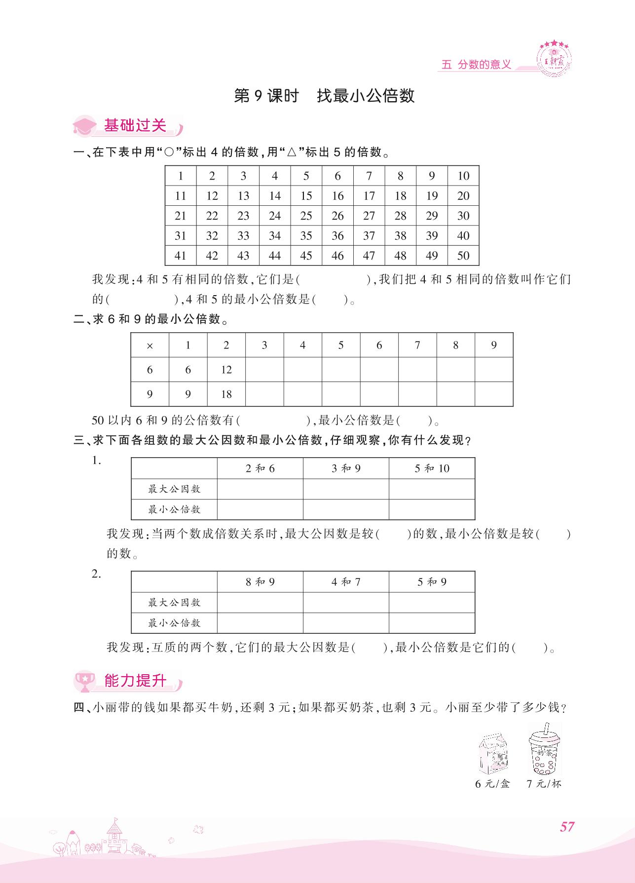 2021上册五年级数学北师版 五 分数的意义——第9课时 找最小公倍数