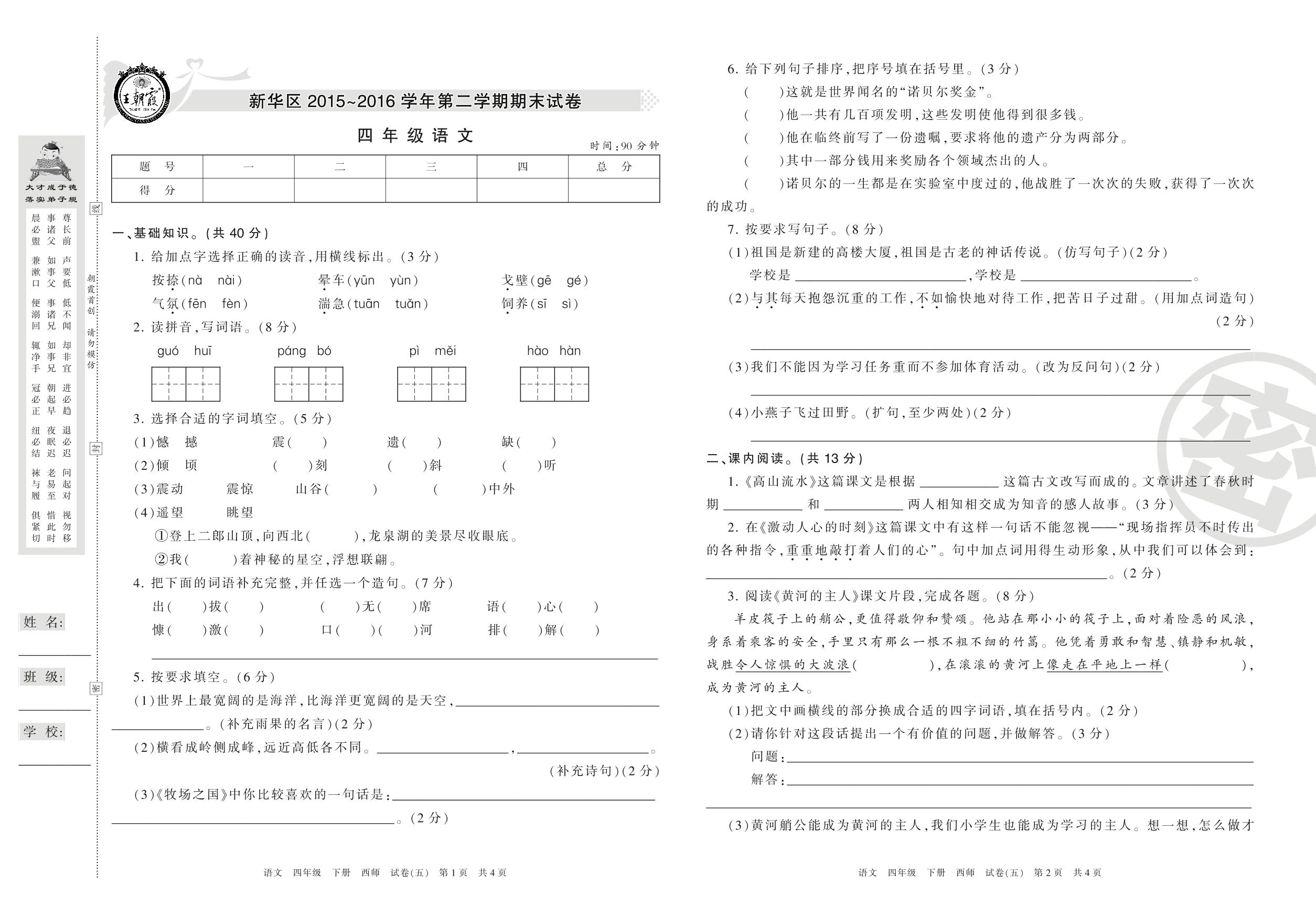 2015-2016学年第二学期平顶山市新华区四年级语文试卷(西师版)【5】