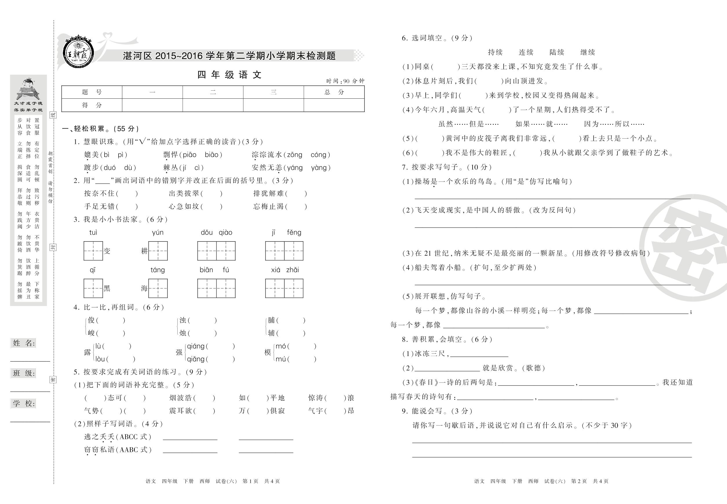 2015-2016学年第二学期平顶山市湛河区四年级语文试卷(西师版)【6】