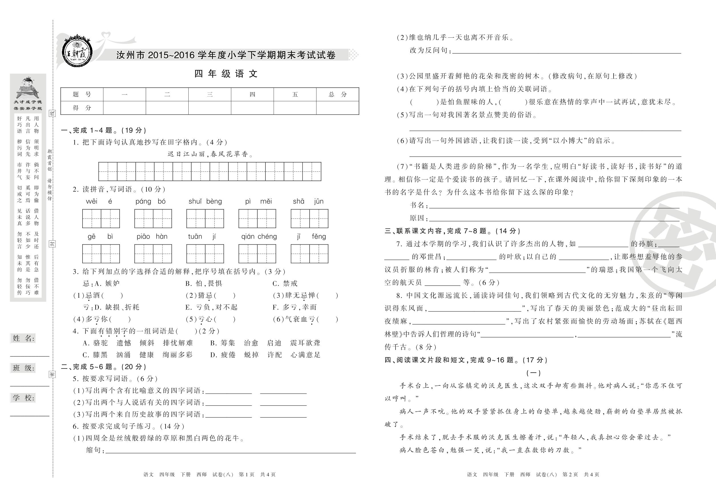 2015-2016学年第二学期汝州市四年级语文试卷(西师版)【8】