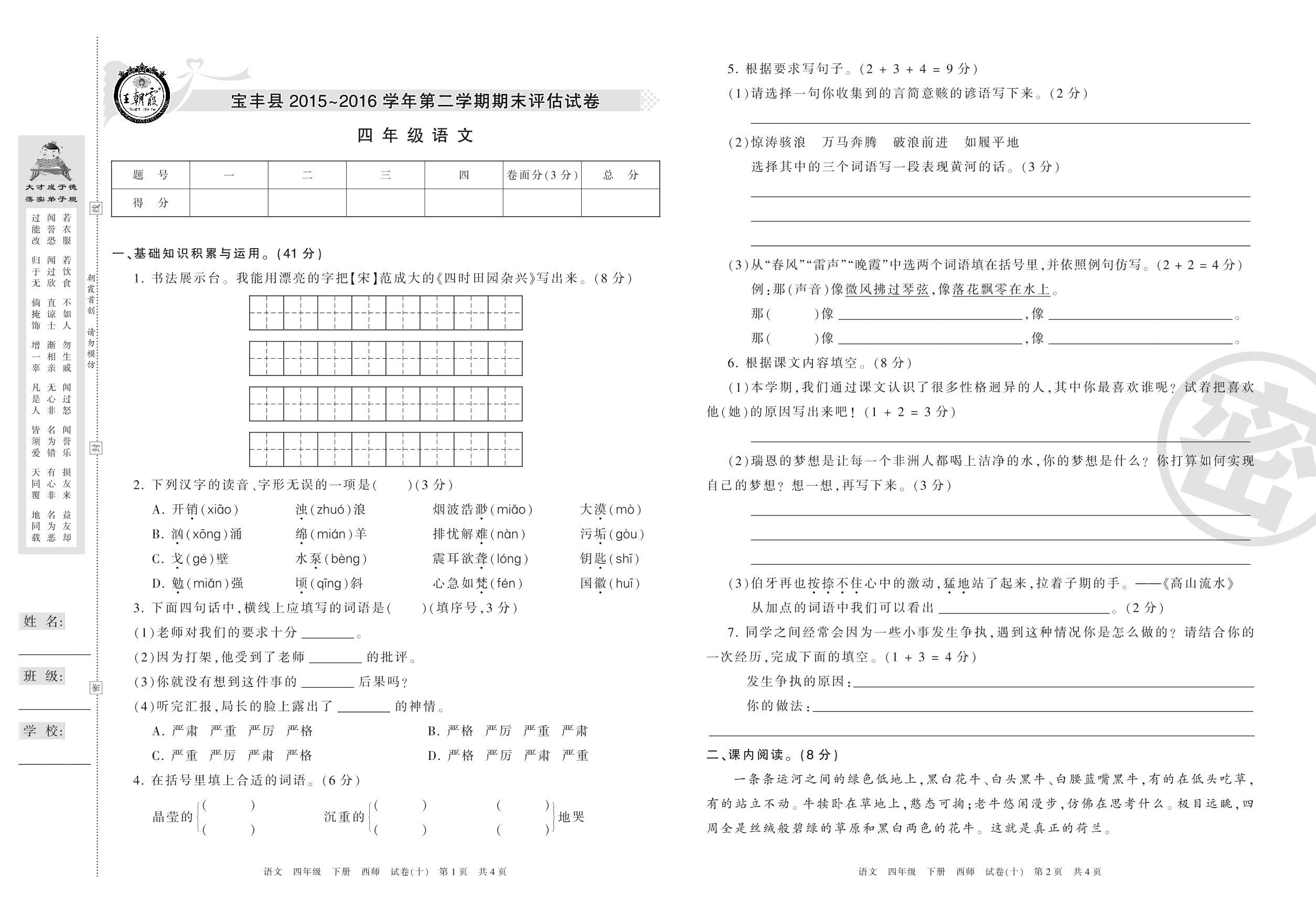2015-2016学年第二学期平顶山市宝丰县四年级语文试卷(西师版)【10】