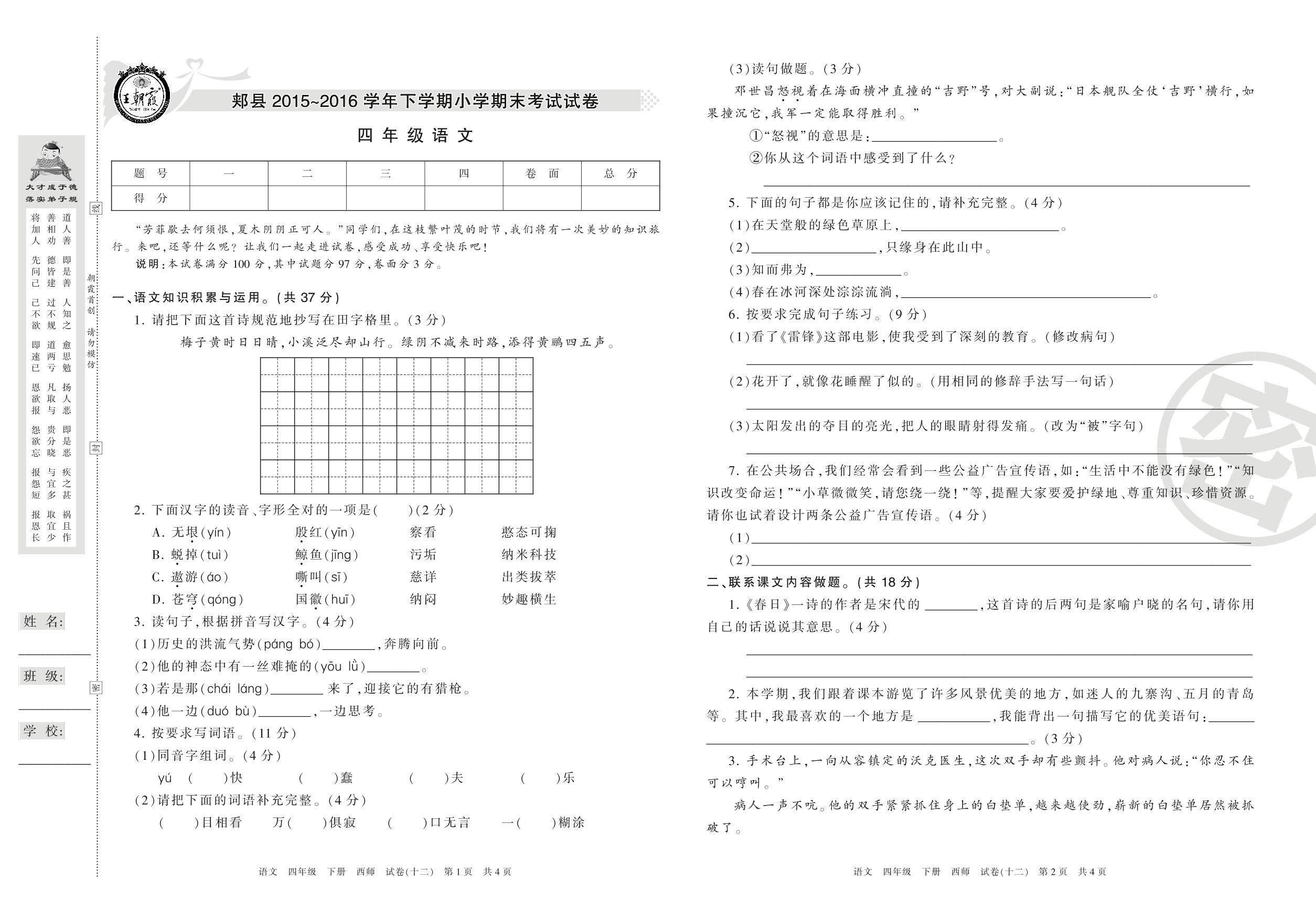 2015-2016学年第二学期平顶山市郏县四年级语文试卷(西师版)【12】