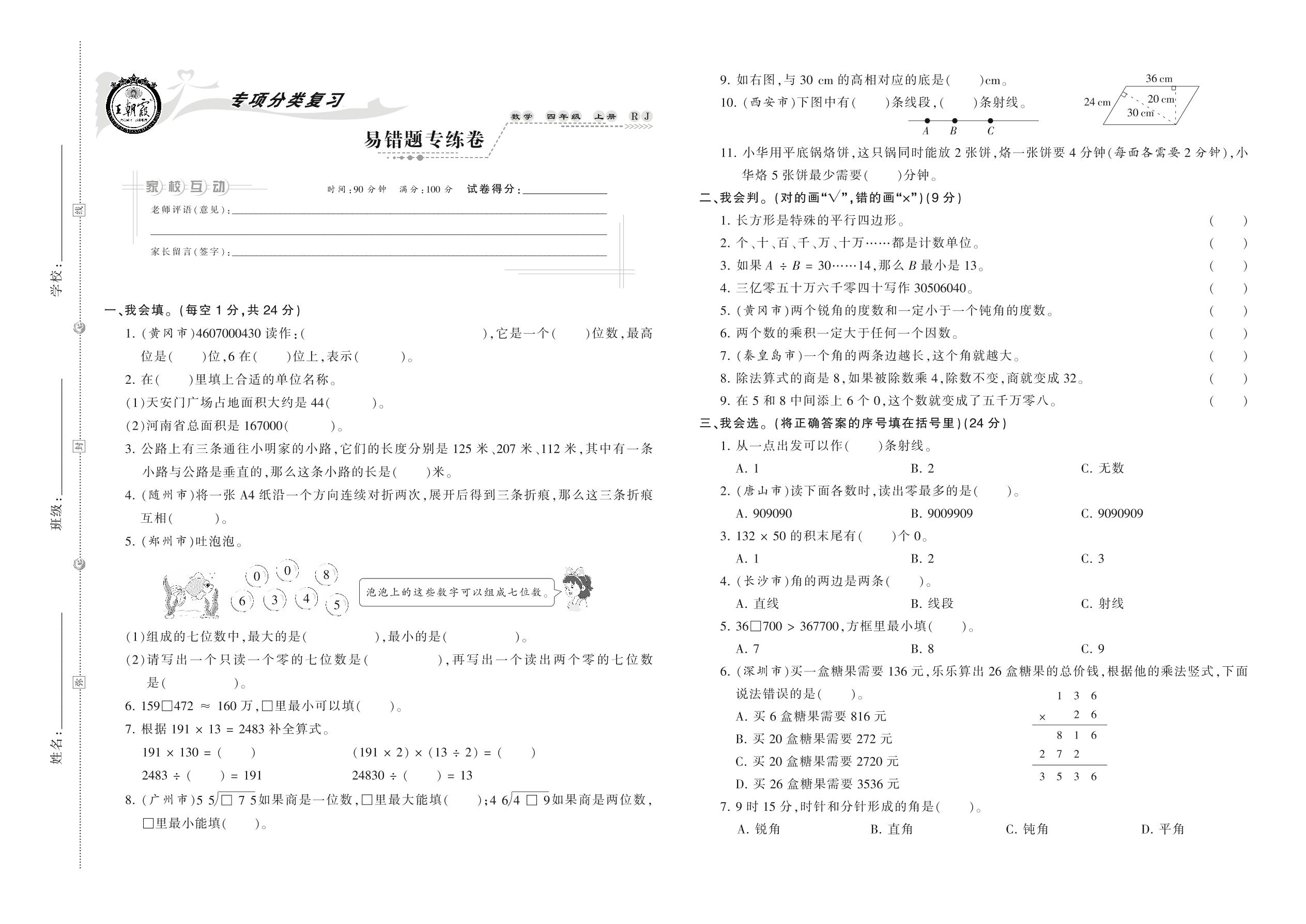 四年级数学人教版上册专项卷