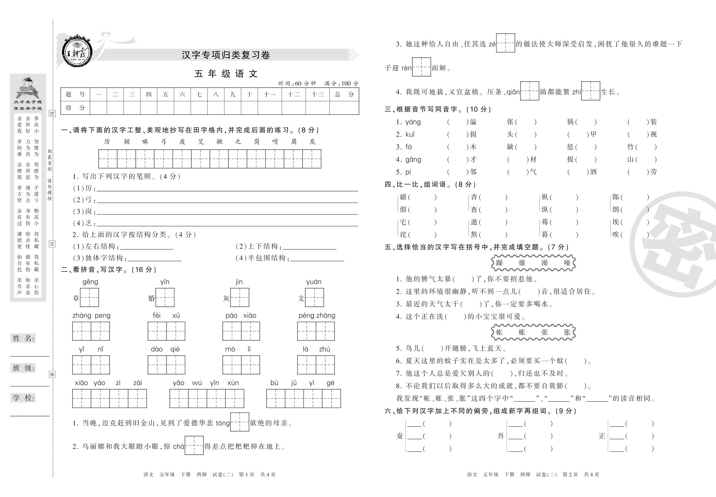 王朝霞期末专项卷五年级下册语文(西师版)_R210801211152【2】