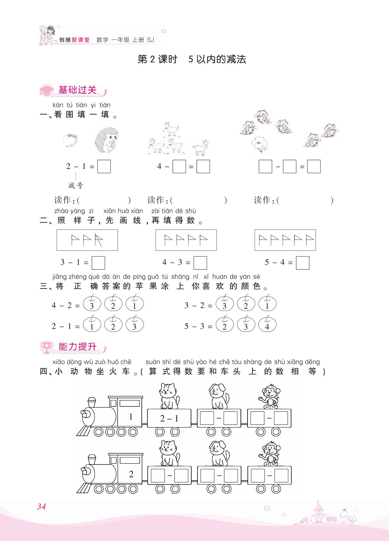 2021上册一年级数学苏教版 八 10以内的加法和减法——第2课时 5以内的减法