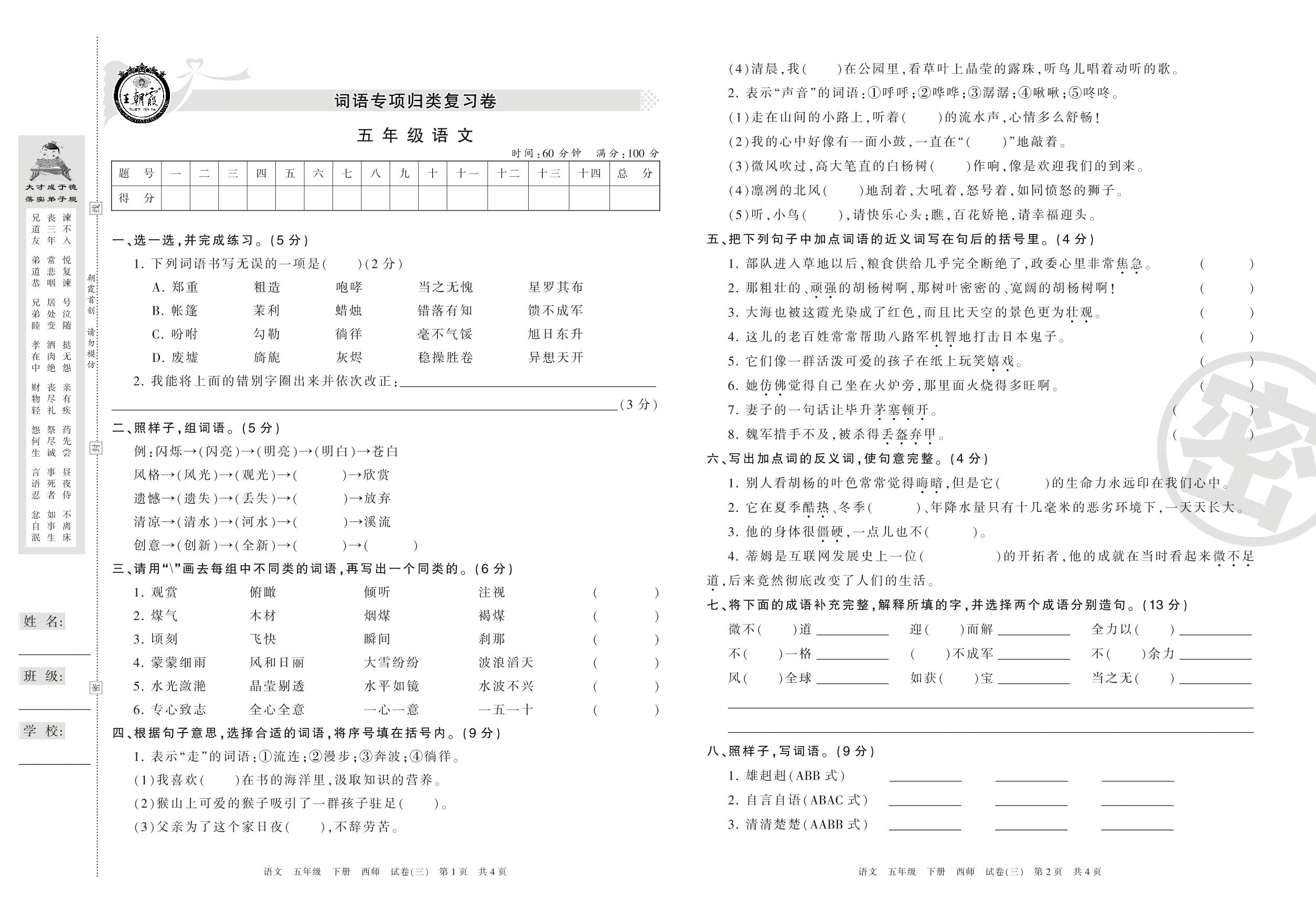 王朝霞期末专项卷五年级下册语文(西师版)_R210801211157【3】