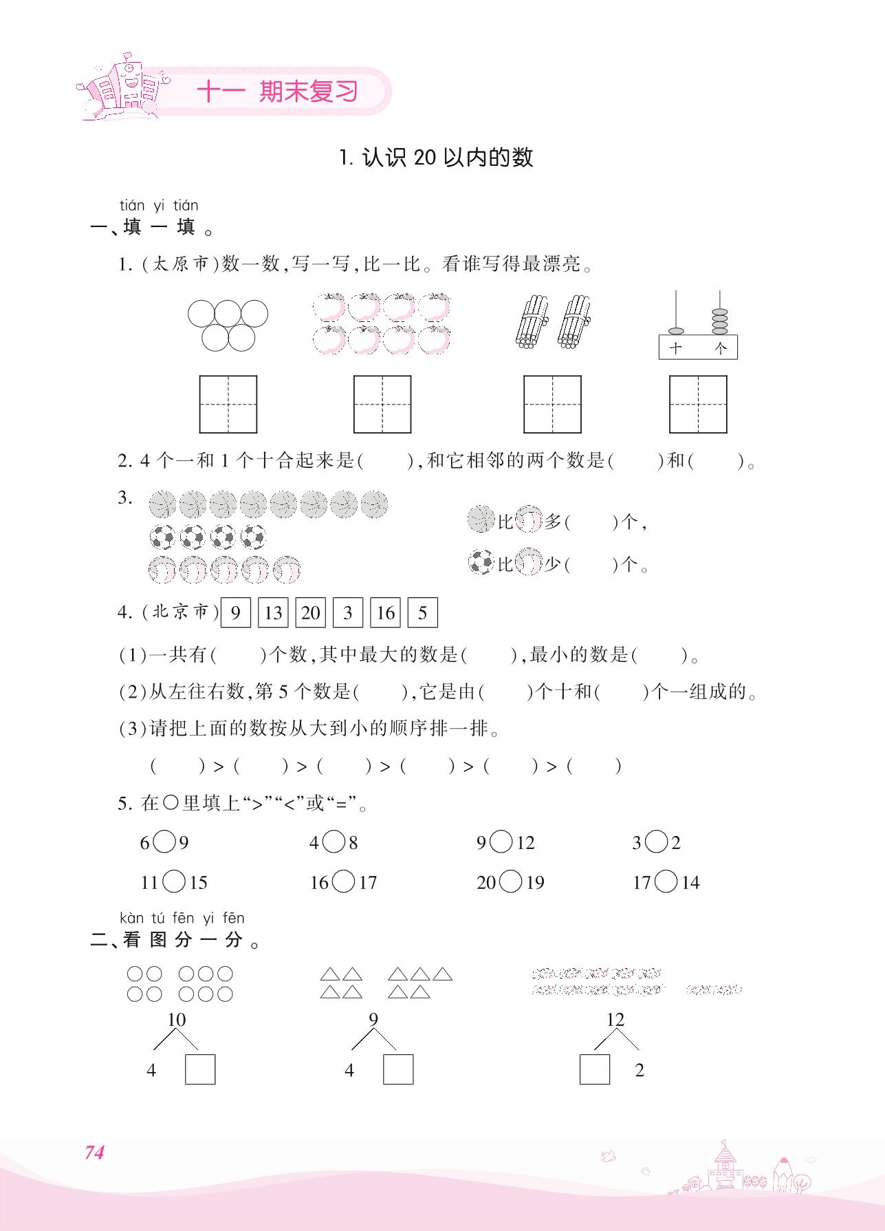 2021上册一年级数学苏教版 十一 期末复习——1. 认识20以内的数