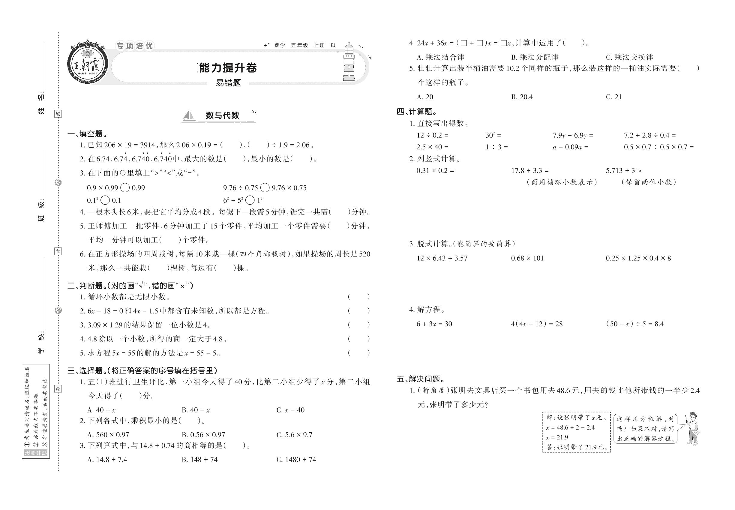 五年级数学人教版上册专项卷