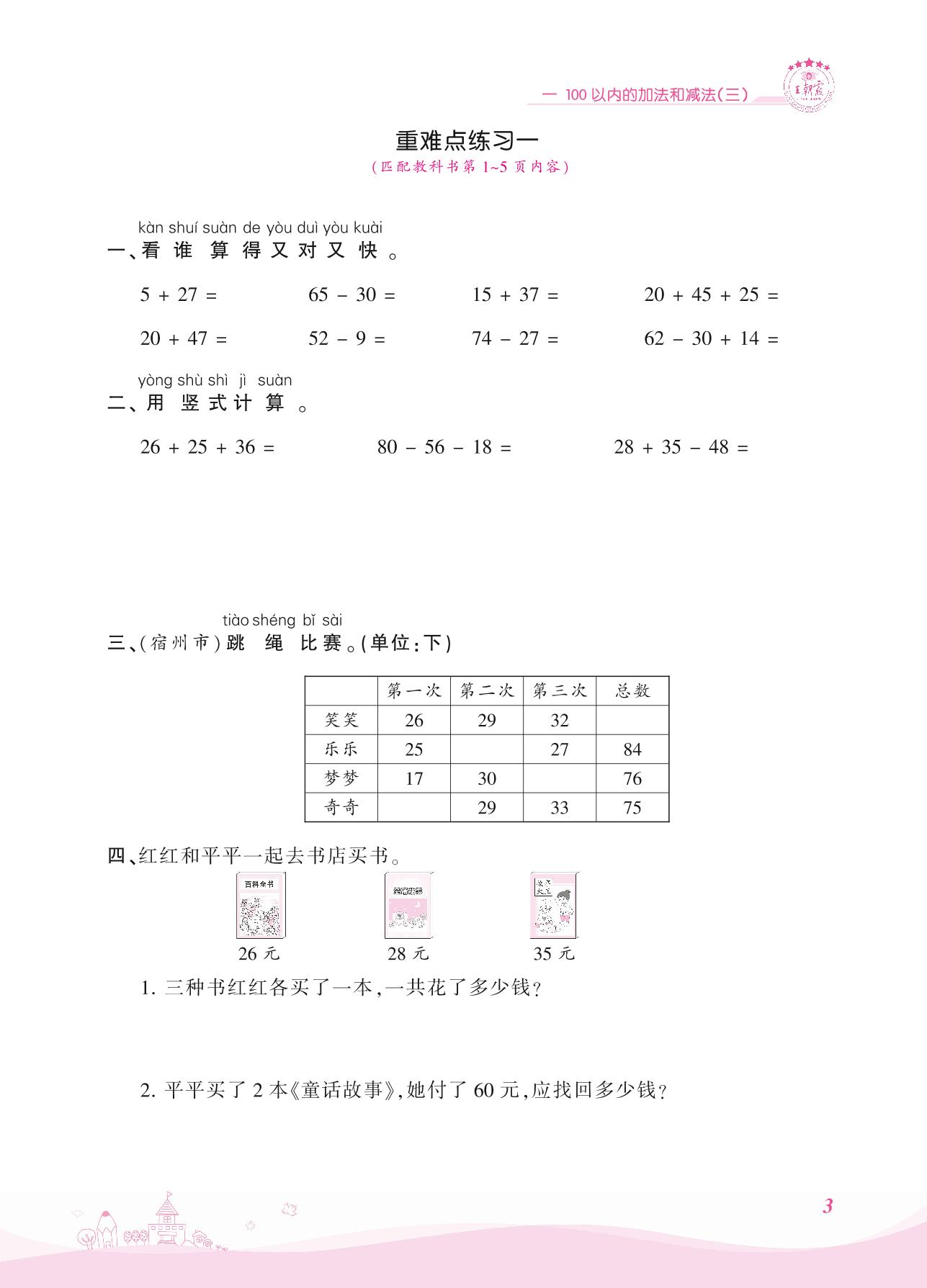 2021上册二年级数学苏教版 一 100以内的加法和减法(三)——重难点练习一