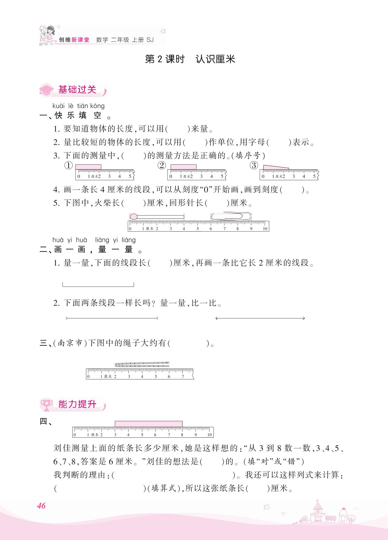 2021上册二年级数学苏教版 五 厘米和米——第2课时 认识厘米