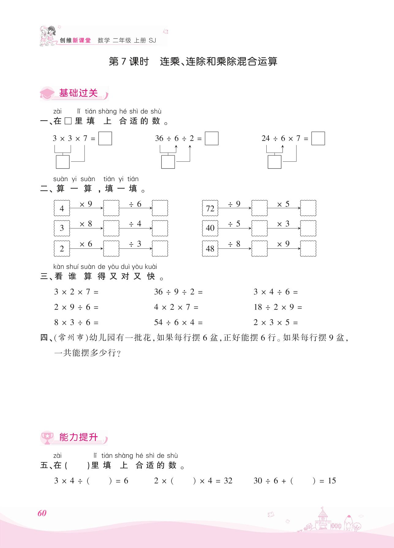 2021上册二年级数学苏教版 六 表内乘法和表内除法(二)——第7课时 连乘、连除和乘除混合运算