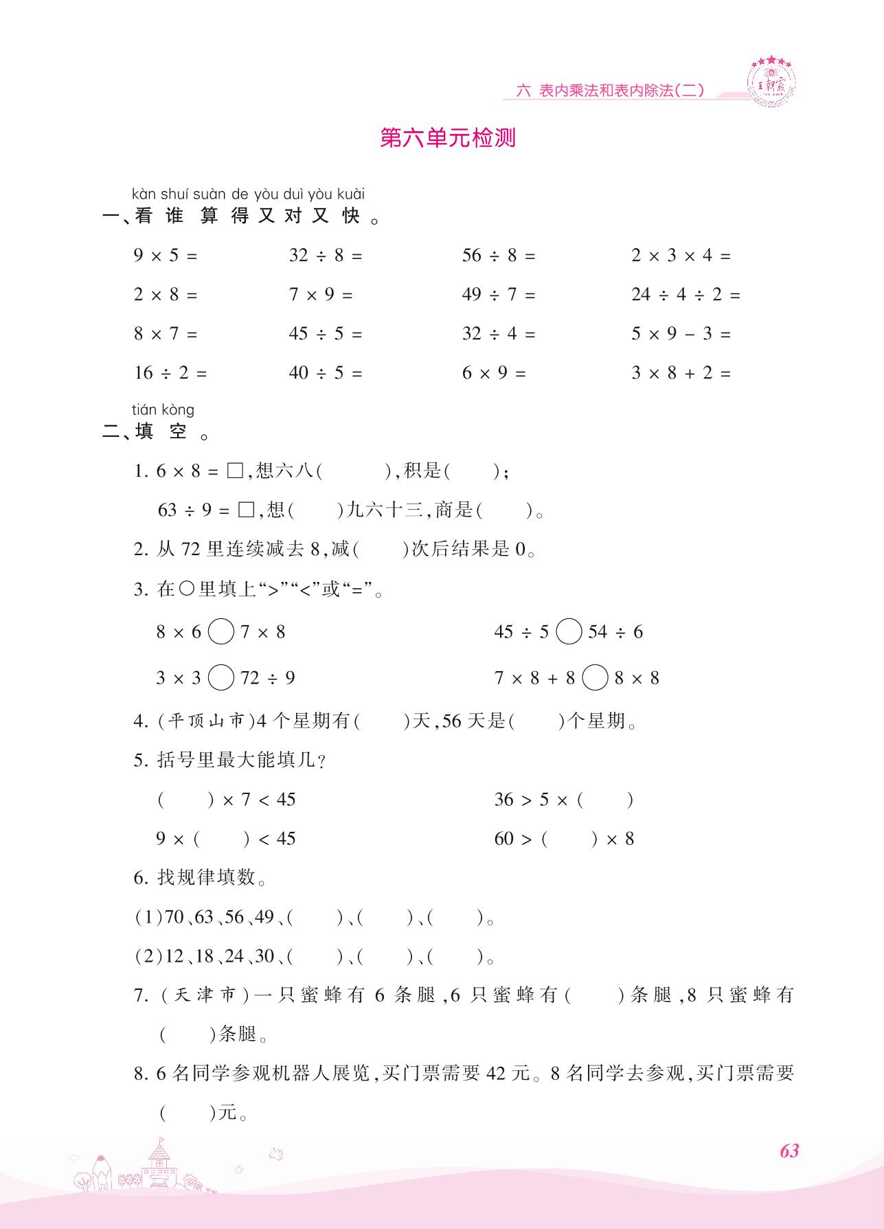 2021上册二年级数学苏教版 六 表内乘法和表内除法(二)——第六单元检测