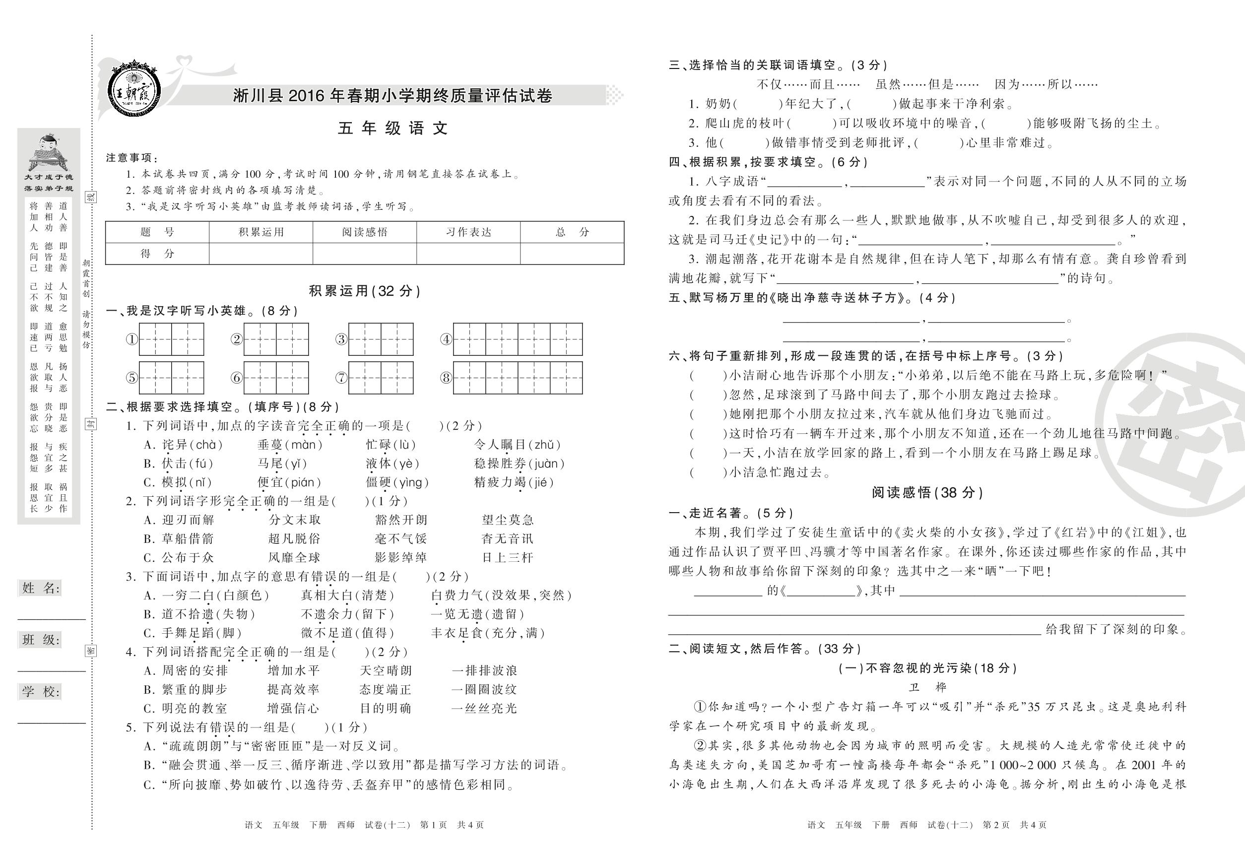 2015-2016学年第二学期南阳市淅川县五年级语文试卷(西师版)【12】