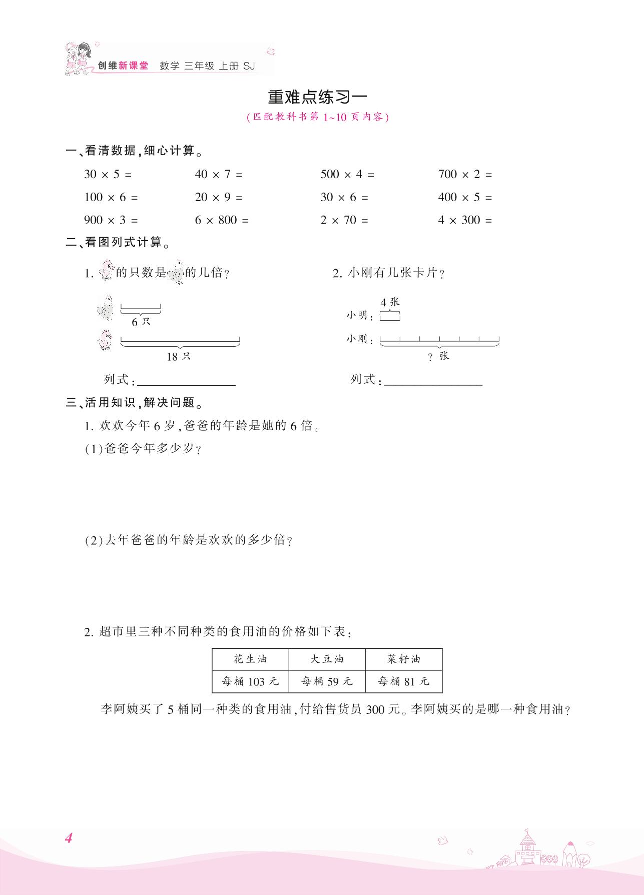 2021上册三年级数学苏教版 一 两、三位数乘一位数——重难点练习一