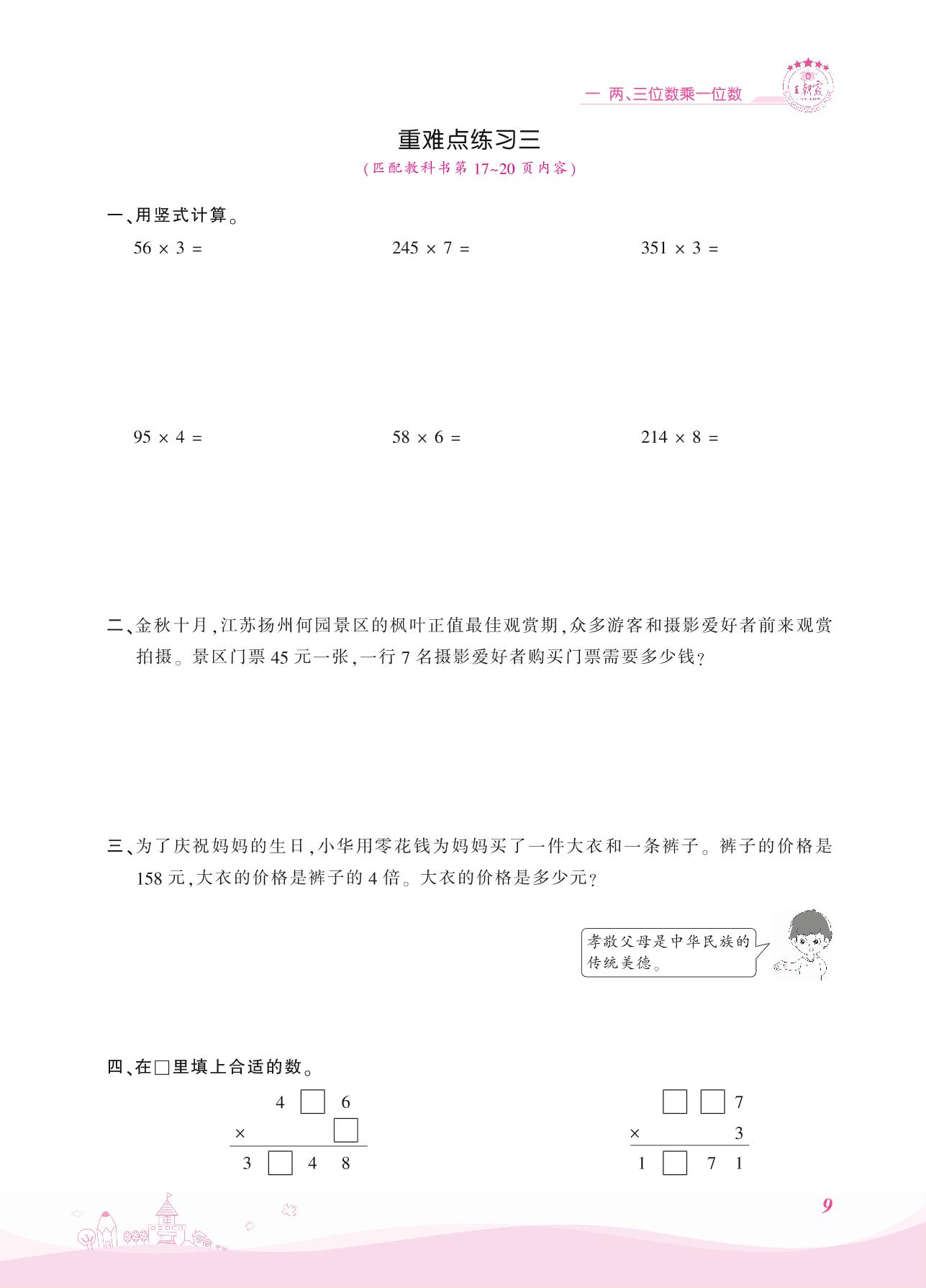 2021上册三年级数学苏教版 一 两、三位数乘一位数——重难点练习三