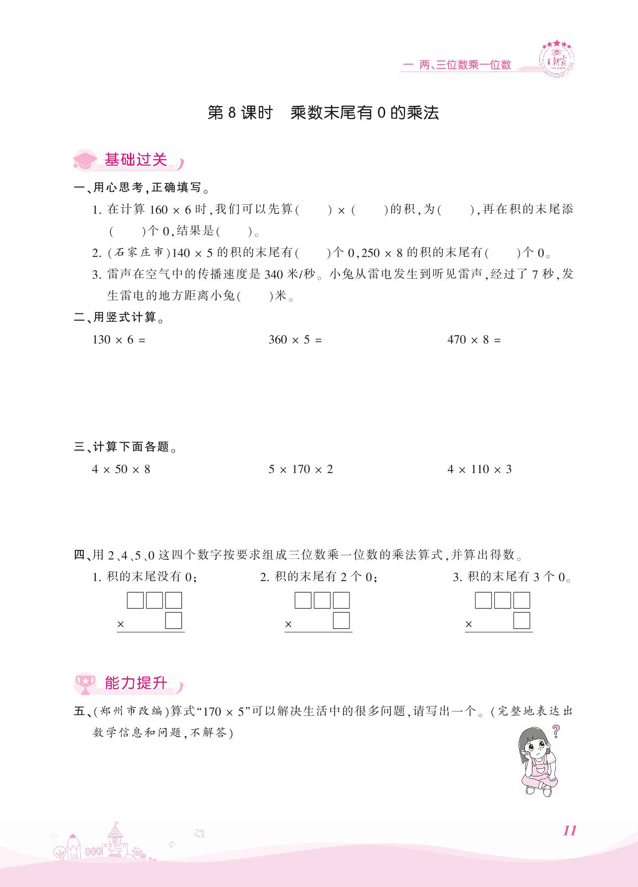 2021上册三年级数学苏教版 一 两、三位数乘一位数——第8课时 乘数末尾有0的乘法