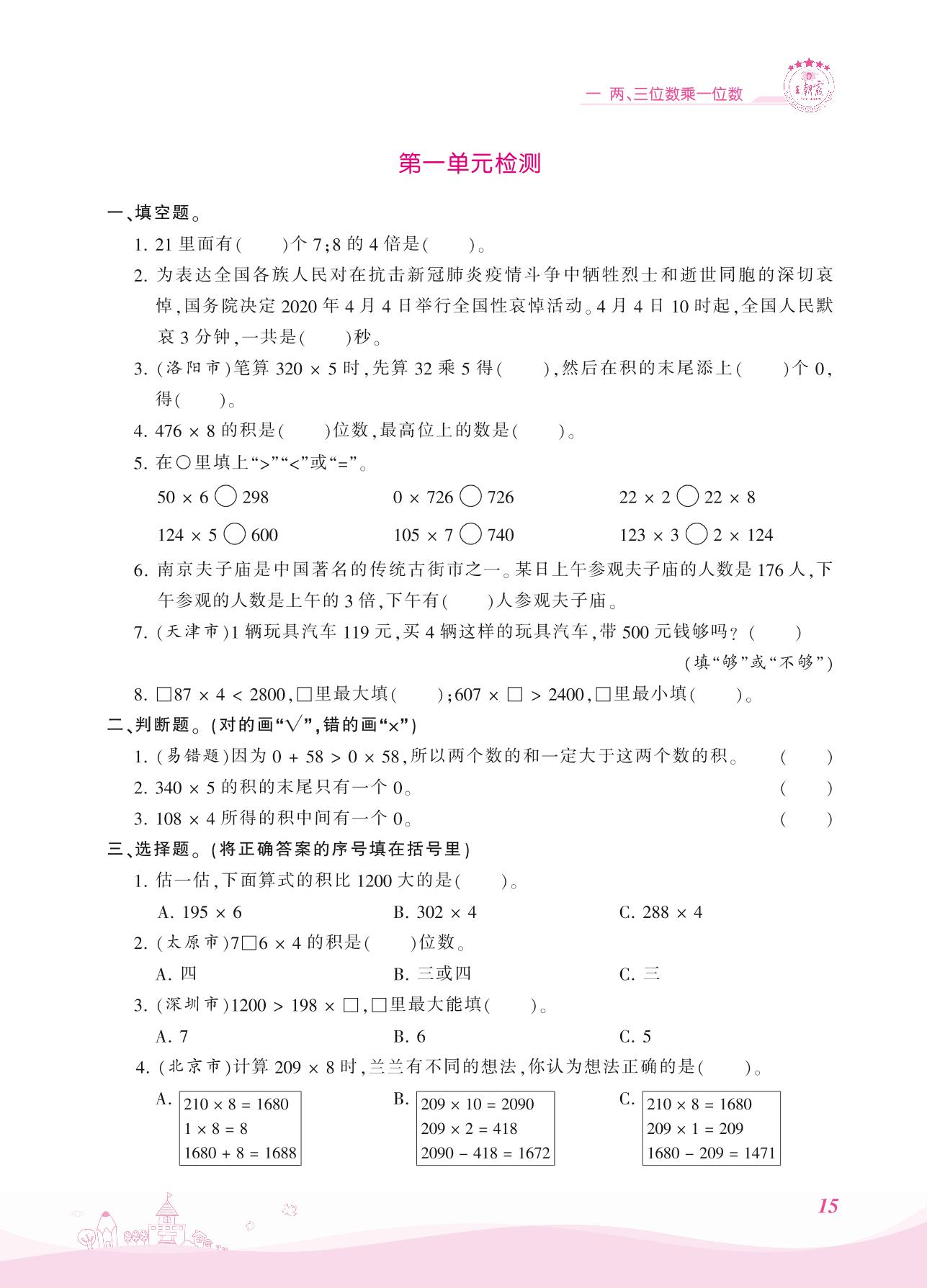 2021上册三年级数学苏教版 一 两、三位数乘一位数——第一单元检测