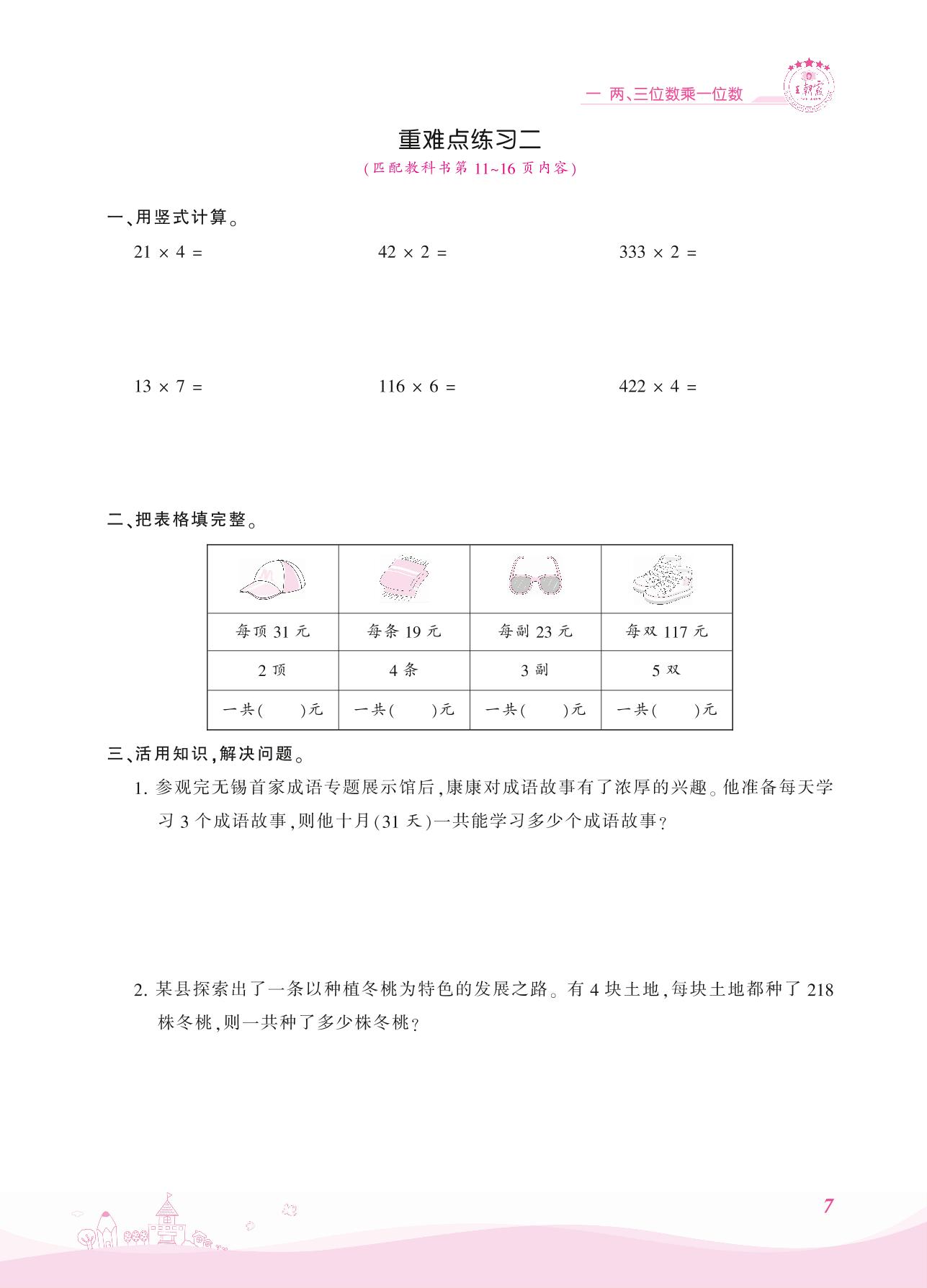 2021上册三年级数学苏教版 一 两、三位数乘一位数——重难点练习二