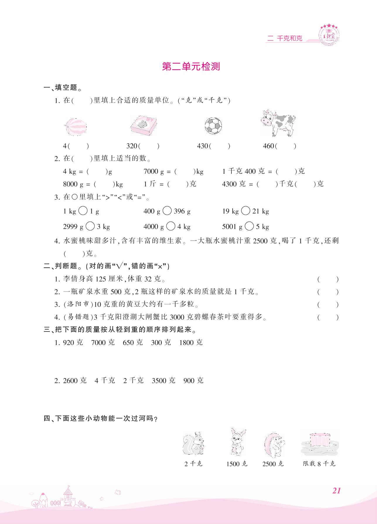 2021上册三年级数学苏教版 二 千克和克——第二单元检测