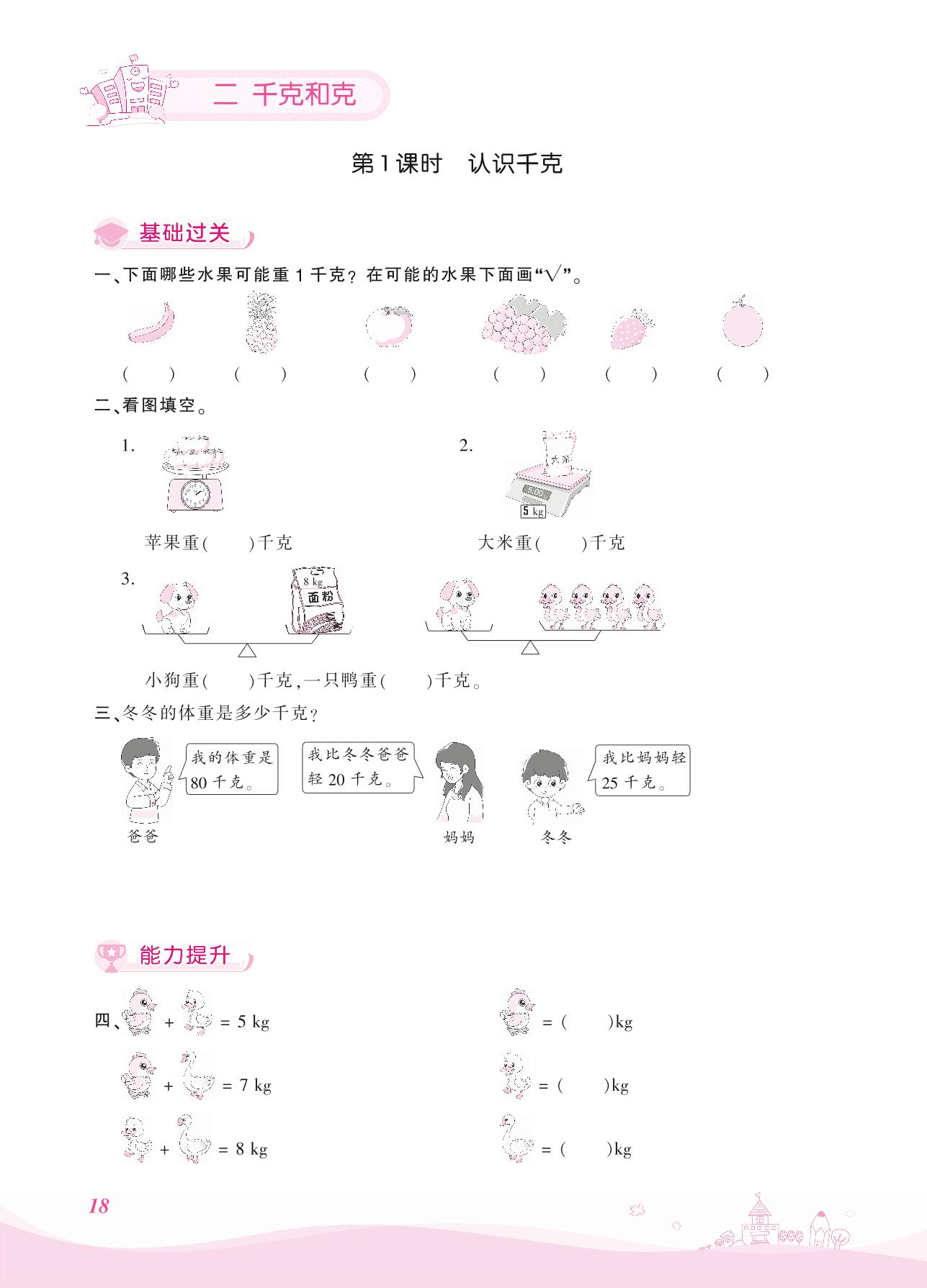 2021上册三年级数学苏教版 二 千克和克——第1课时 认识千克