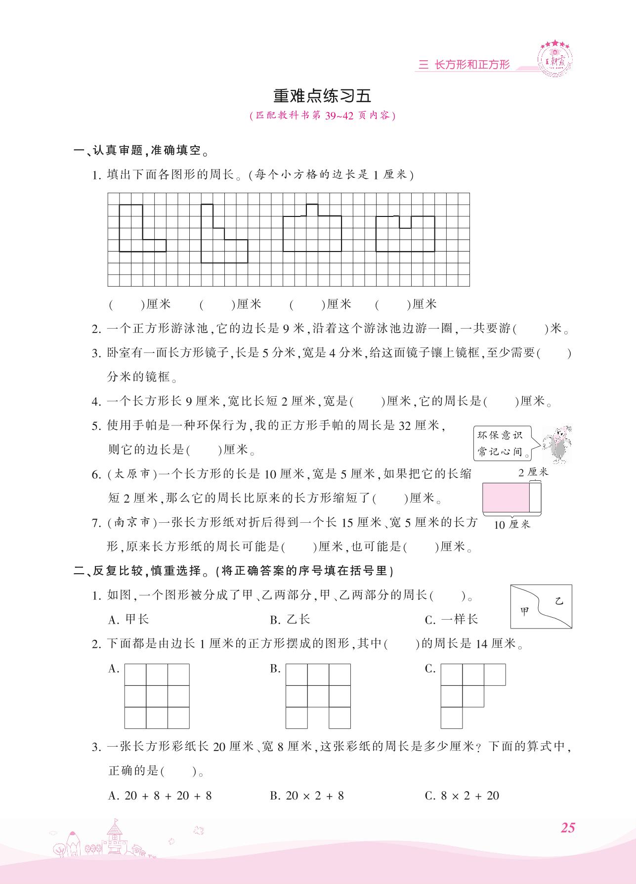 2021上册三年级数学苏教版 三 长方形和正方形——重难点练习五