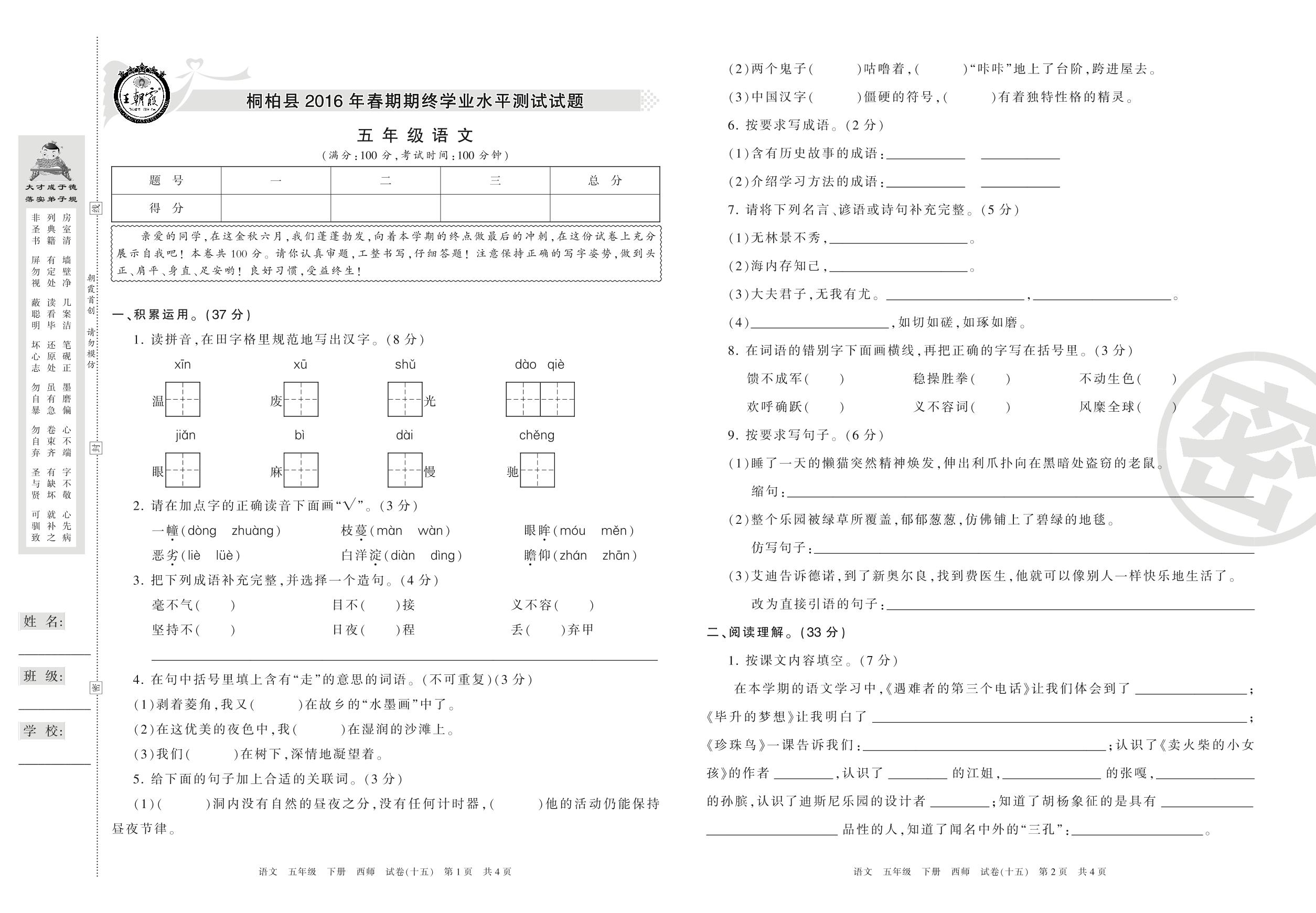 2015-2016学年第二学期南阳市桐柏县五年级语文试卷(西师版)【15】