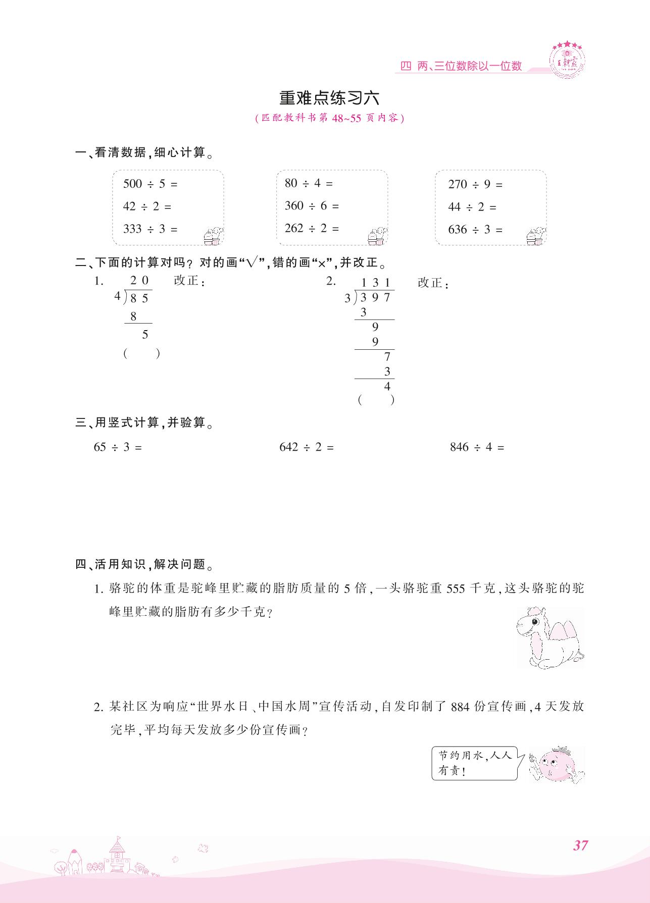 2021上册三年级数学苏教版 四 两、三位数除以一位数——重难点练习六